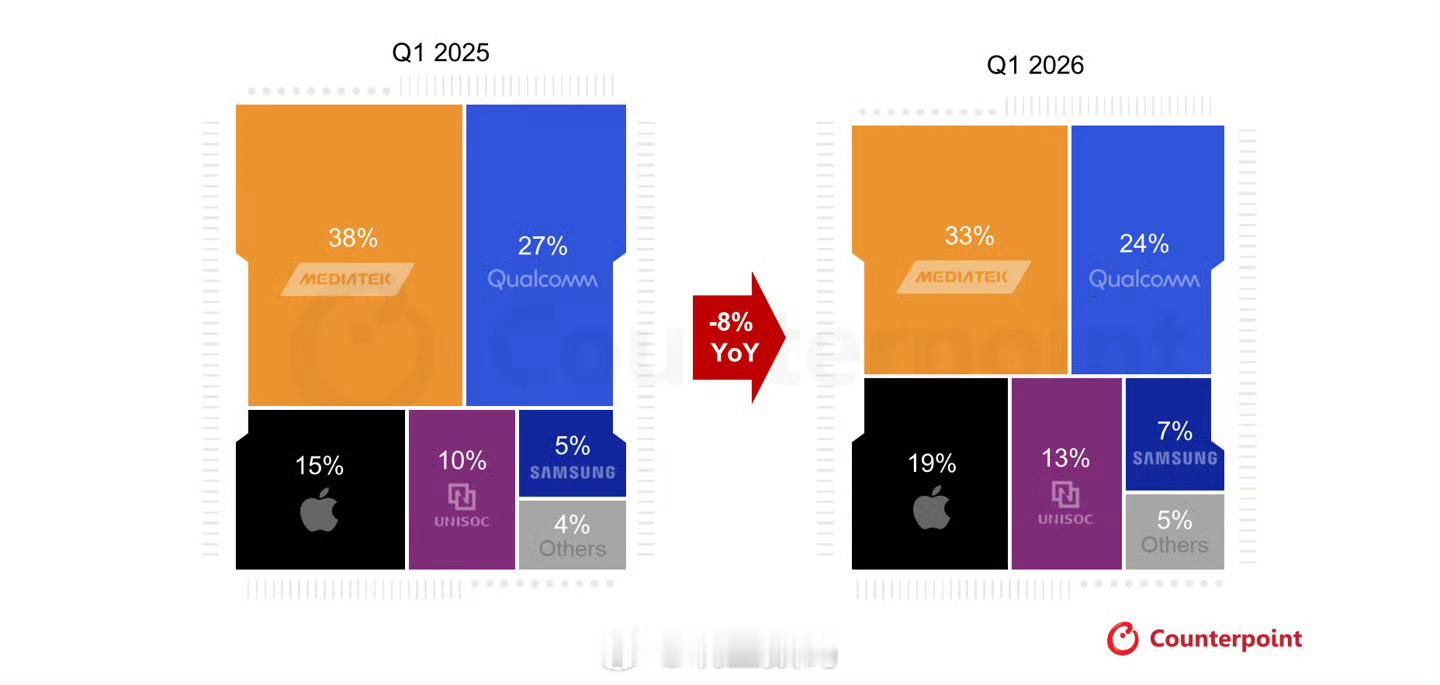 26年第一季度全球智能手机 SoC 出货量同比下降 8%,看起来涨价影响还是非常大呀。