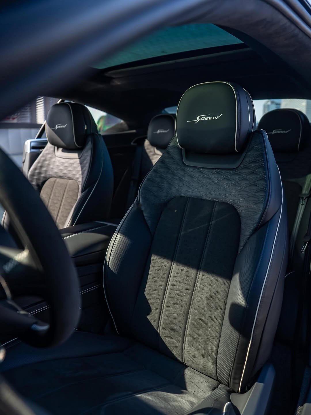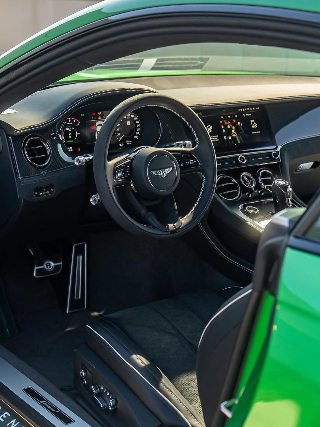 谁能拒绝这抹绿?宾利欧陆GT Speed太绝了,头枕刺绣的Speed标识是性能的专属勋章,黑色Alcantara档把+碳纤维内饰,运动感直接拉满, 天蝎排气的声浪,是绅士的咆哮宾利欧陆