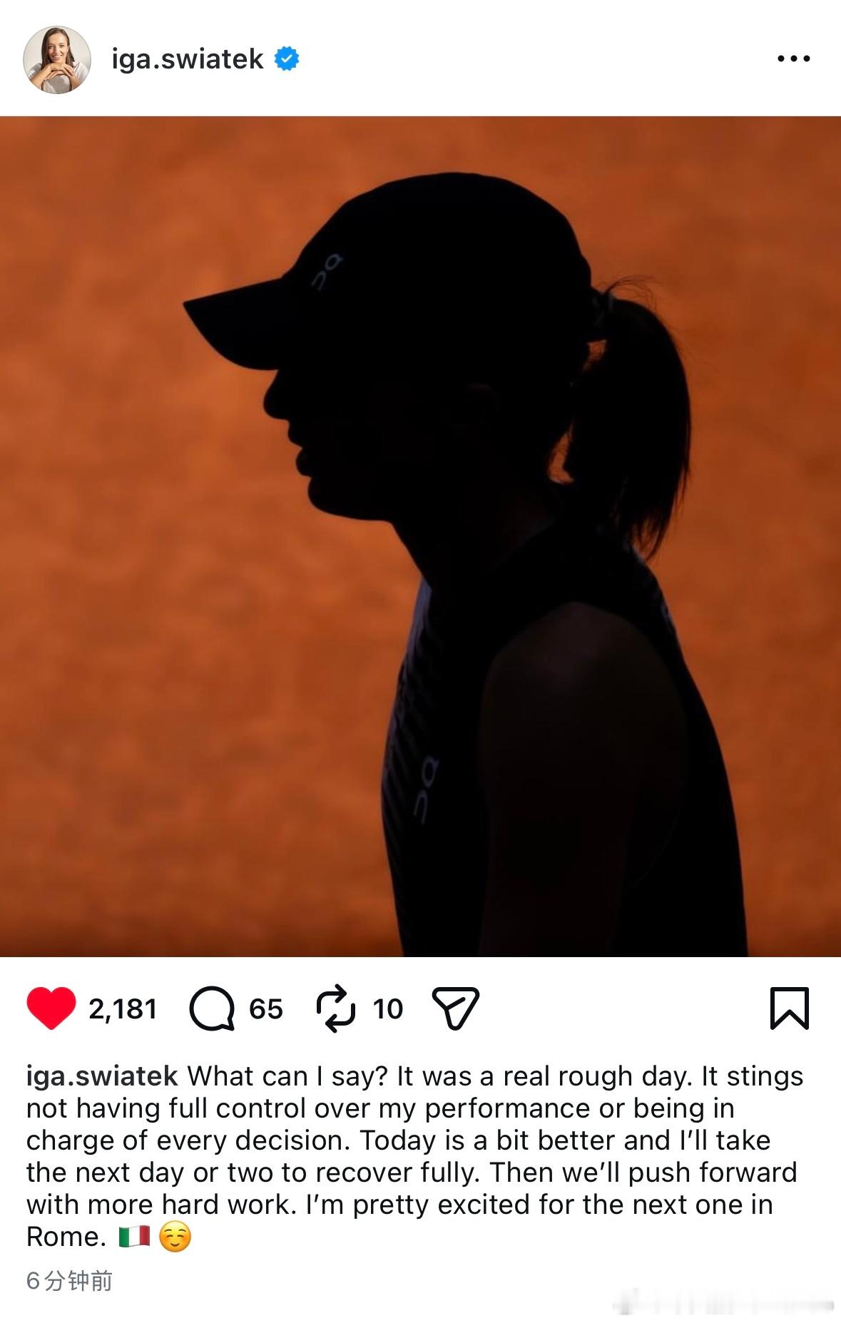 斯瓦泰克:“我还能说什么呢…真是糟糕透顶的一天。无法完全掌控自己的赛场表现、无法主导每一次决策,这种感觉真的很煎熬。今天状态好了一些,接下来的一两天我会好好调整,彻底恢复过来。之后我们会带着更刻苦的训练继续向前冲。我已经对罗马站的下一场比赛充满期待🇮🇹😊”wta