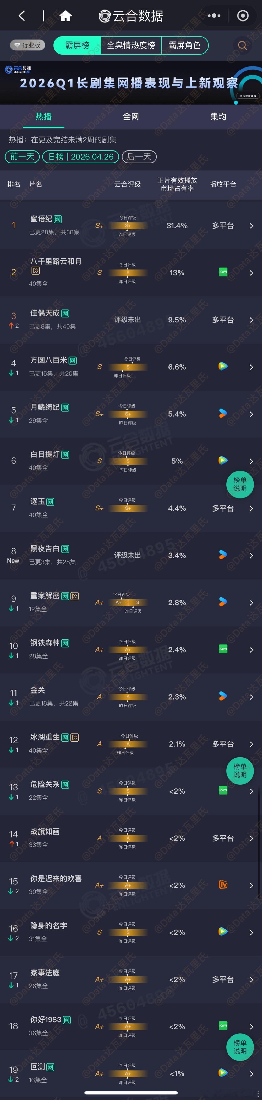 4.26云合占比蜜语纪 31.4%,约6005万八千里路云和月 13%,约2485万佳偶天成 次日9.5%,约1815万方圆八百米 6.6%,约1260万月鳞绮纪 5.4%,约1030万白日提灯 5%,约955万逐玉 4.4%,约840万黑夜告白 首日云合 3.4%,约650万