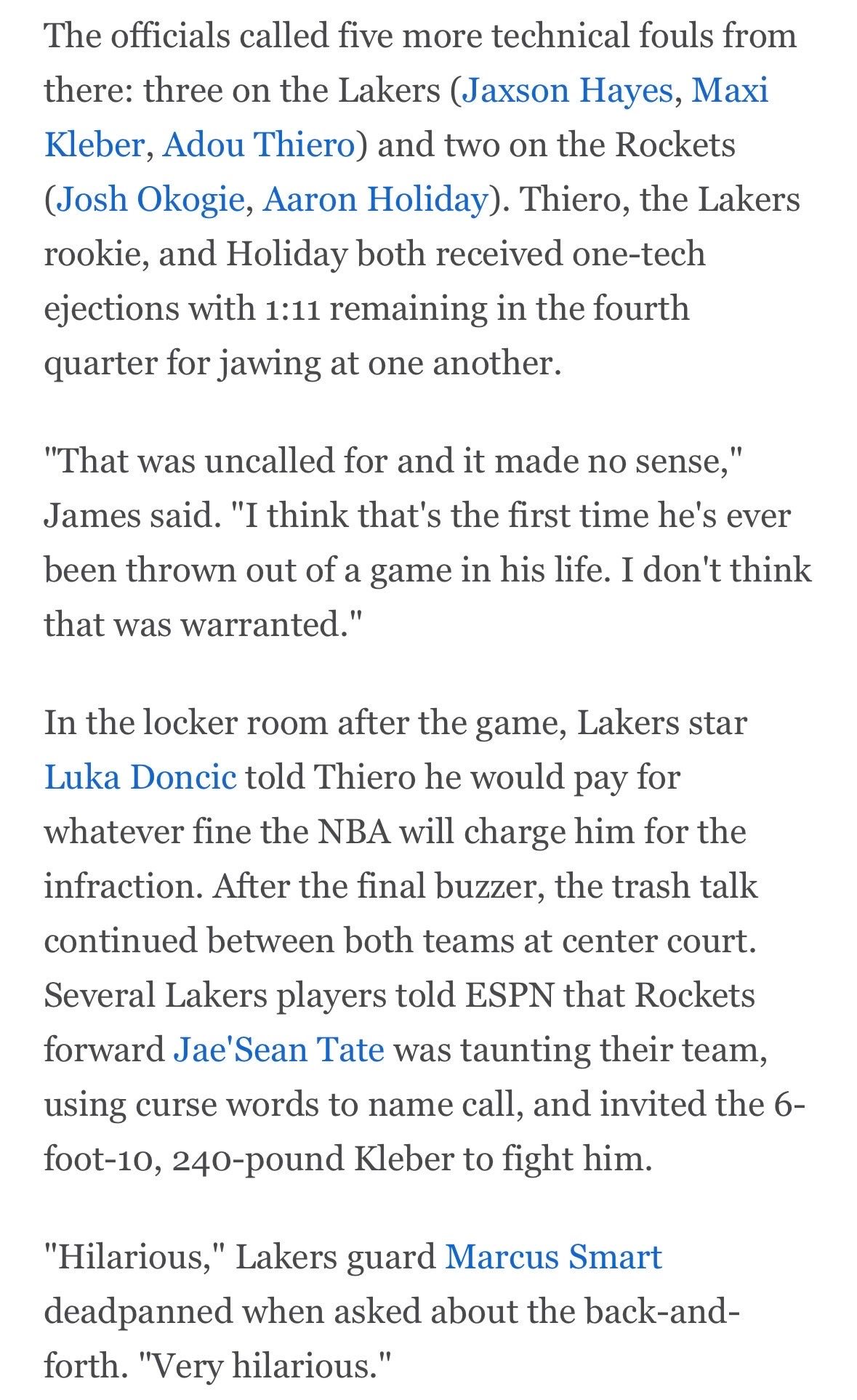 东契奇表态会为新秀蒂耶罗支付任何联盟对他的罚款。终场哨响后,两队之间垃圾话仍在继续。多名湖人球员向ESPN透露,火箭球员泰特一直在嘲讽他们的球队,用脏话辱骂,还挑衅身高6英尺10英寸、体重240磅的克勒贝尔和他单挑。