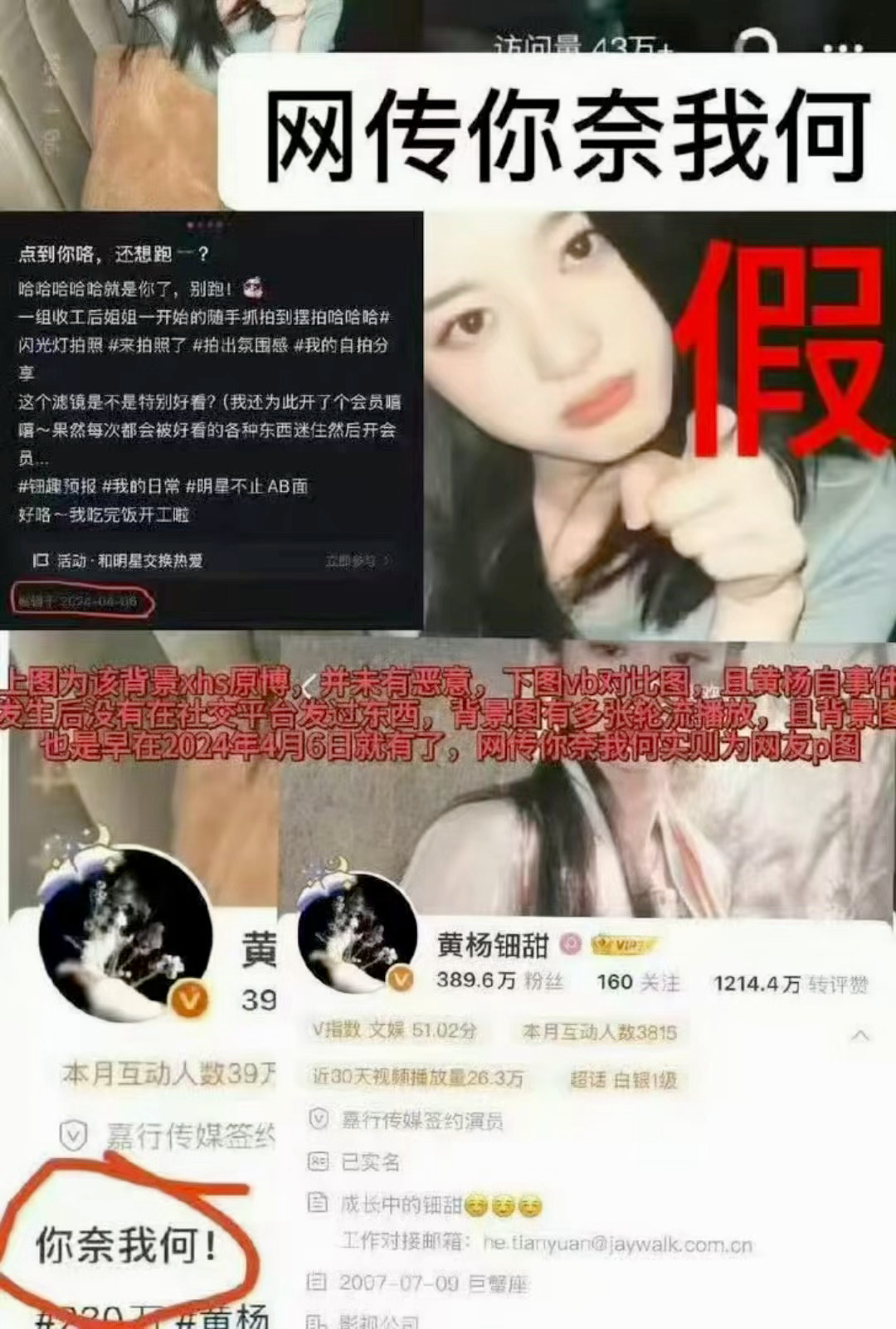 黄杨钿甜回应你奈我何p图事件 原来这句话竟然是网友p图啊,想当初好多网友都被误导了,包括我在内。原图是五福期间的随手拍,一年之后被黑子翻出来p图,说这是黄杨钿甜回怼网友的嘲讽态度,但她其实压根没说过这四个字。