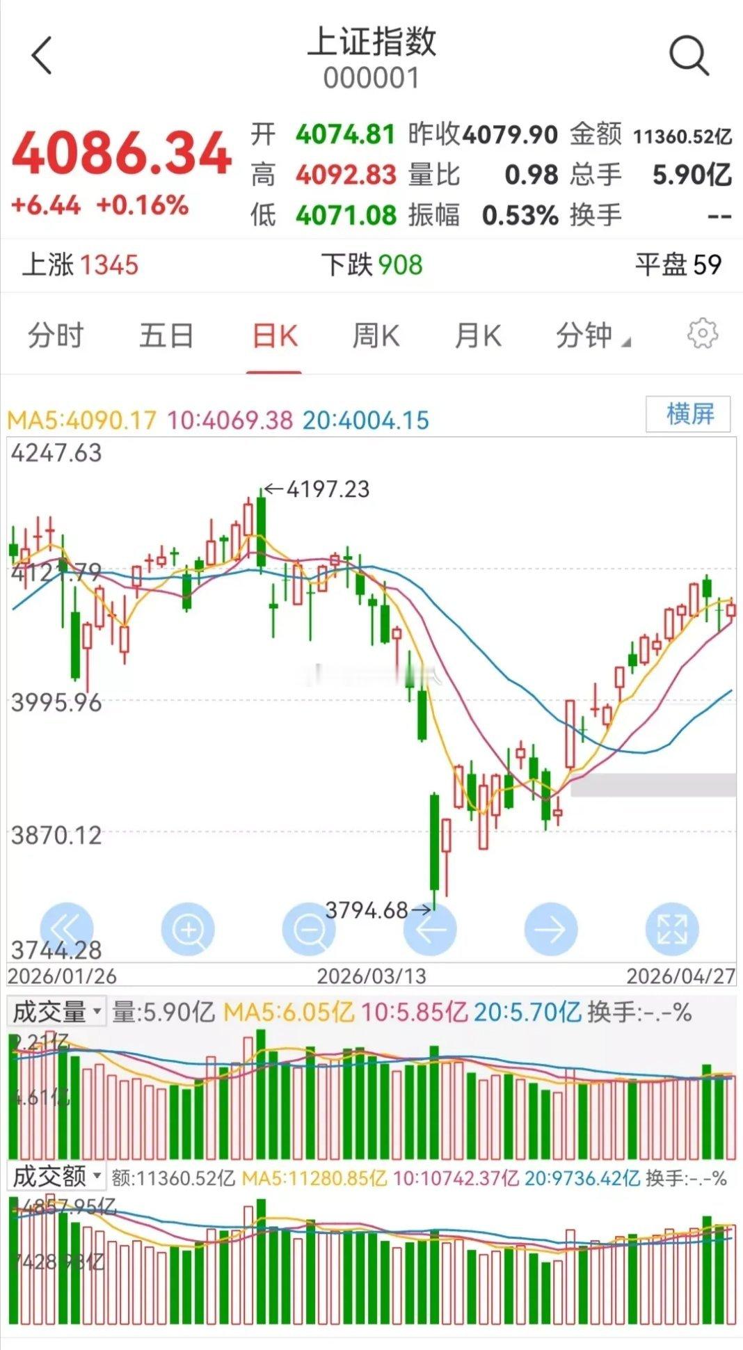 大盘简评(4月27日收盘)今天沪指小幅收红,最终站上4086点目前指数稳稳站在10日、20日均线之上,本轮反弹的上升趋势完全没有走坏。隔壁日韩、台股市都在持续刷新历史新高,咱们A股现在还没摸到4100关口,后续空间依然存在。另外中东紧张局势出现缓和信号,一旦后续谈判落地,之前压在市场头上的最大利空基本就消解了。不过马上就要到五一长假,资金避险意愿会抬升,接下来这3个交易日,整体横盘震荡的可能性最高。若无突发重磅利好/利空,预判明天(4月28日周二):全天维持窄幅来回拉扯,尾盘小幅收涨,继续收下一根小红K。⚠️以上仅为个人复盘心得,不构成任何投资建议,股市有风险,入市需谨慎!A股 上证指数 大盘分析