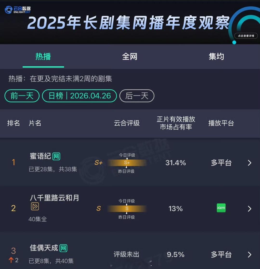 佳偶天成云合第三佳偶天成云合前三数据能打,CP更好嗑!云合第三配得上这“天作之合
