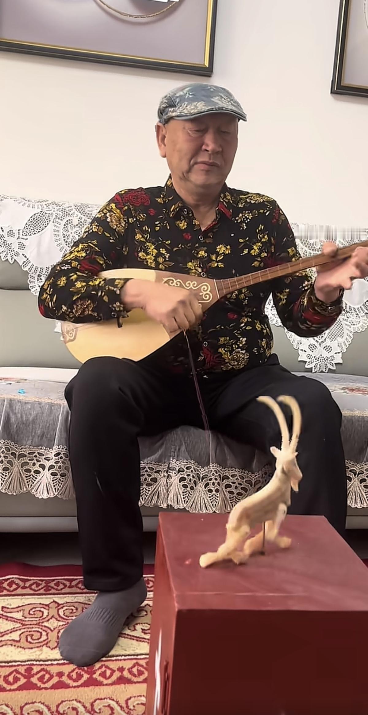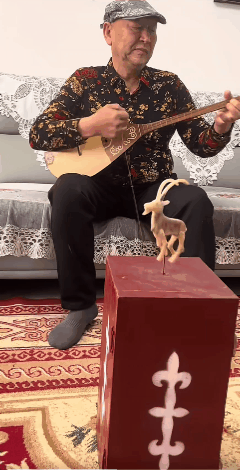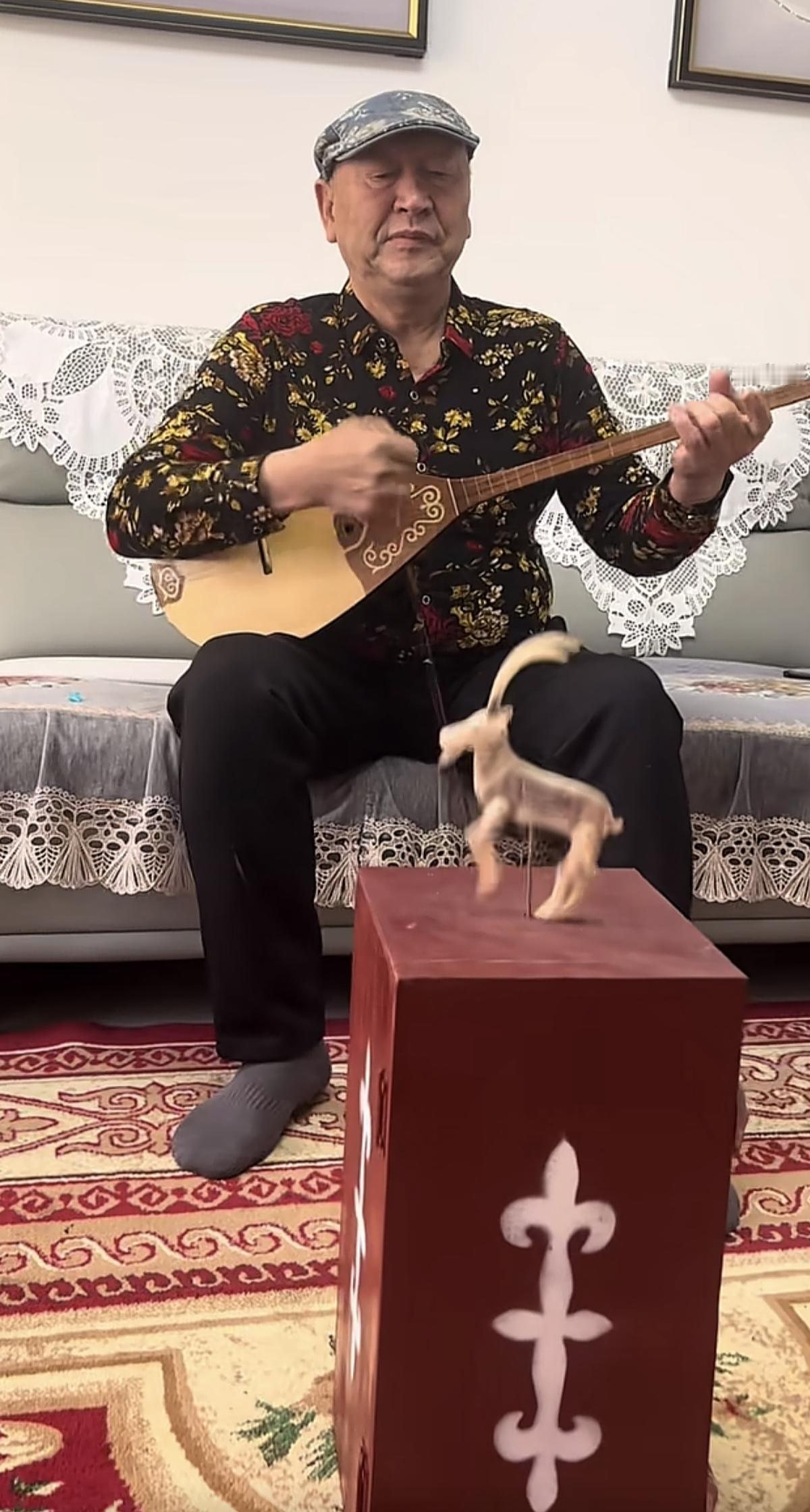 这位哈萨克族老艺人,这一边弹奏冬不拉,还一面让小山羊木偶伴舞。这究竟是木偶戏,还是皮影戏,亦或者是情景剧呀!见过给皮影戏,木偶戏配音,伴奏的,没见过木偶给冬不拉伴舞的呀!这可真是太神奇了!这属不属于哈萨克族的非物质文化遗产呀!