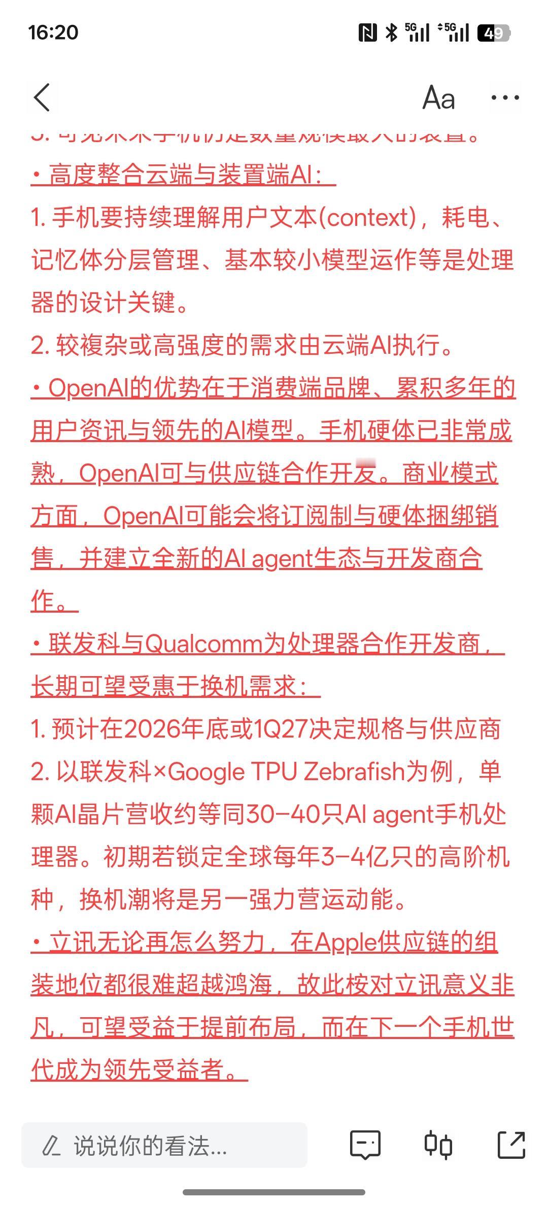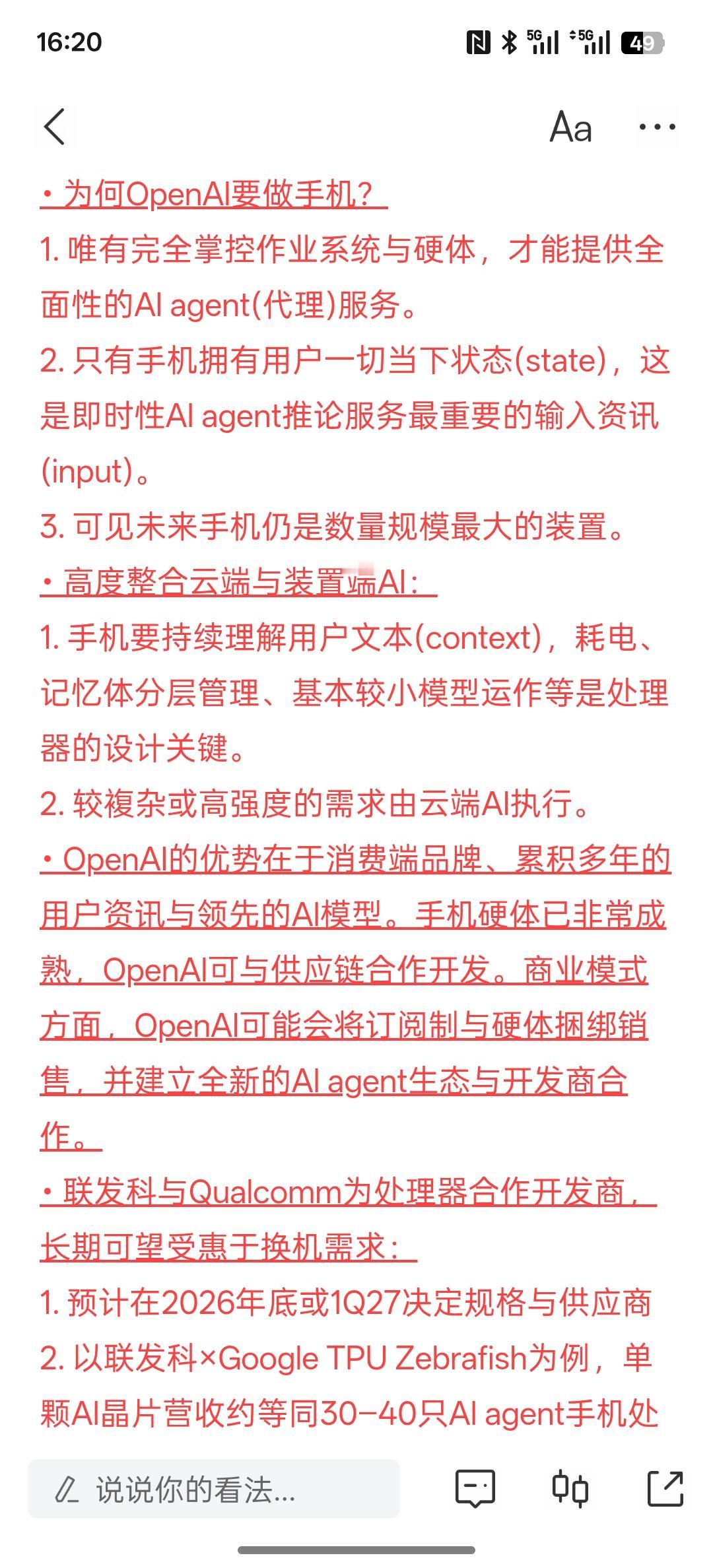利好消息,OpenAI将重新定义手机,联发科、Qualcomm与立讯为该AI agent手机关键供应商!按照目前的AI人工智能发展未来的手机,必然是实现AI智能手机!手机行业也在发生变化!AI人工智能手机的时代,未来肯定会到的!未来的手机成为AI智能手机,将是AI智能的终端!手机与万物互联AI人工智能甚至云端都是相互连接!未来的手机定义就是AI智能终端!