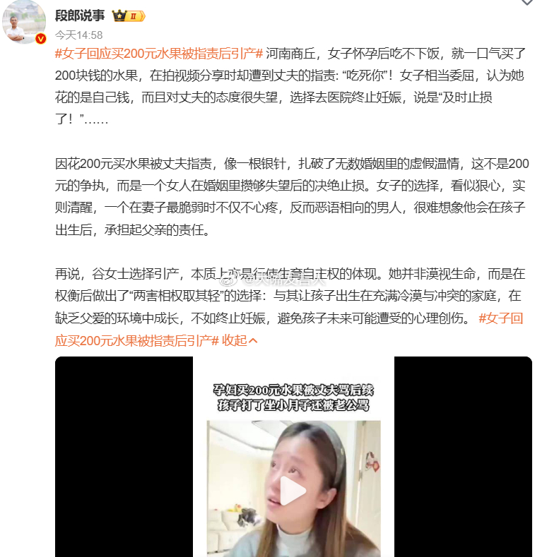 女子回应买200元水果被指责后引产,热点观点