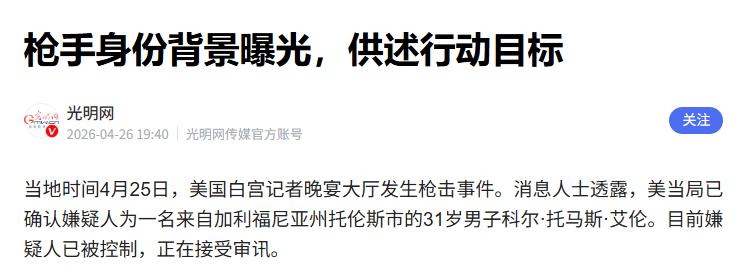 枪手身份曝光! 4月25日晚,美国白宫记者晚宴发生枪击事件,据CBS新闻获悉,嫌疑人是一名教师,曾于2024年在加利福尼亚州托兰斯获得“本月教师”奖,有消息人士证实,31岁的艾伦曾是辅导服务机构托兰斯C2教育公司的教师,毕业于加州理工大学,他于2024年12月被C2评为“本月教师” 美国东部时间 2026 年 4 月 25 日晚,华盛顿希尔顿酒店原本挺热闹,一年一度的白宫记者协会晚宴正在这里举行,总统特朗普、第一夫人梅拉尼娅以及一众政要、记者出席,本是一场轻松的社交活动,结果一声枪响,瞬间打乱了一切,也吸引了全美的目光。 安保人员迅速冲入宴会厅,高喊 “趴下!趴下!”,现场顿时混乱,宾客慌忙寻找掩护,特朗普也被特勤人员紧急护送撤离,撤离途中一度踉跄,画面被拍下。此时人们才确认,不是意外声响,是真枪实弹。 没过多久,多家美国媒体援引执法部门消息确认了枪手身份—— 并非穷凶极恶的惯犯或反社会无业人员,而是 31 岁的科尔・托马斯・艾伦,一名兼职教师,同时也是独立游戏开发者。 艾伦的学历背景十分亮眼:2017 年毕业于加州理工学院,获机械工程学士学位,后在加州州立大学多明格斯山分校取得计算机科学硕士学位。加州理工是全球顶尖理工院校,能考入者堪称学界精英。 更令人意外的是,艾伦的教学工作表现出色:2024 年 12 月,他在加州托兰斯的 C2 教育公司获评 “本月教师”,足见其教学能力与口碑俱佳。 一名顶尖名校高材生、受认可的优秀教师,为何会携带武器,试图闯入白宫记者晚宴这一高规格场合? 据官方通报,艾伦以酒店住客身份提前入住,携带霰弹枪、手枪及多把刀具,试图冲击特勤局安检关卡、强闯宴会厅入口,最终在宴会厅外走廊被执法人员拦下并制服,未进入宴会厅。 交火中,一名特勤局特工中弹,因身着防弹背心无生命危险;艾伦未中弹,被送医评估,将于 2026 年 4 月 27 日出庭受审,面临暴力犯罪中使用枪支、袭击联邦执法人员等指控。 事件背后的原因至今令人费解:拥有高学历、稳定工作与荣誉的艾伦,为何走向极端?有观点猜测或与精神健康问题有关,也有人指向美国社会环境,但官方尚未公布完整动机结论。 这起事件看似偶然,实则折射出美国长期存在的深层问题 ——枪支泛滥已成顽疾。即便白宫记者晚宴这类场合安保严密,从当天下午起就加强警戒、封闭相关区域、设置多道安检,仍被人携带多类武器接近核心区域,暴露出枪支管控的严重漏洞。 美国控枪难,根源众所周知:一是宪法第二修正案对持枪权的解读长期存在争议,拥枪群体将个人持枪权绝对化,导致控枪举措易被指为 “违宪”;二是枪支利益集团游说势力强大,长期通过政治献金等方式影响政客立场,使控枪议题沦为政治 “烫手山芋”,久拖不决。 回到艾伦:他本可在讲台上传道授业、助力学生圆梦,如今却站在被告席,沦为公共安全威胁嫌疑人。这不仅是他个人的悲剧,更折射出美国社会的撕裂与病灶。目前官方尚未确认其极端行为与社会撕裂、极端思想传播的直接关联,但外界普遍认为这些因素值得警惕。 近年来,美国枪击事件频发,校园、商场、街头乃至高规格官方活动场所都难幸免。每次悲剧发生后,政客多以哀悼、表态应对,却始终难以推动实质性控枪改革,枪支照常流通,游说依旧进行,最终买单的仍是普通民众。
