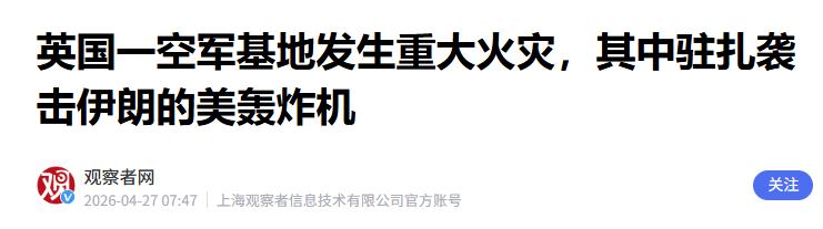 特朗普又迎来一个坏消息! 4月26日,英国费尔福德空军基地发生了一场大规模火灾,最开始是一个仓库起火,后来蔓延到了整个建筑物,屋顶也塌了,这个基地是美军在欧洲的重要军事基地。 4 月 26 日,英国格洛斯特郡的乡村夜空被一把大火照得通红,滚滚黑烟像条巨大的黑龙直冲天际,连几公里外的居民都被惊动,纷纷关上窗户躲避可能的有害物质。 这可不是哪个农场或仓库意外起火,而是英国皇家空军费尔福德基地 —— 这个美军在欧洲最核心的战略轰炸机前哨站烧起来了。 从社交媒体流传的视频看,那场面确实吓人,火光映红了半边天,浓烟在夜空中久久不散,不知情的还以为是哪个大片的拍摄现场。 有意思的是,官方通报来得很快,调子也很统一。英国格洛斯特郡消防部门说,这是一场意外,初步判断是电线老化引发的火灾。 美国空军第 501 战斗支援联队随后发布官方声明,说火势已经被控制,没有人员伤亡,基地里的飞机、跑道和机库都安然无恙,甚至没波及到存放弹药和燃油的高危区域。声明特别强调,起火建筑位于非飞行区,是一座废弃的小卖部,远离核心军事设施。 这话听着让人安心,也符合事实。要知道,这个费尔福德基地可不是一般的地方,它是美军在欧洲为数不多能起降 B-52、B-1B 甚至 B-2 这类重型战略轰炸机的基地之一。自从今年 3 月 1 日英国政府点头同意美军使用这里以来,这里就成了美军空袭伊朗的 "核心跳板"。 短短一个多月前,8 架 B-1B"枪骑兵" 轰炸机先后来到这里,紧接着又有 3 架 B-52H"同温层堡垒" 飞抵,一下子就让这个平日里安静的英国乡村基地变成了美军在欧洲的 "轰炸机大本营"。 这些大家伙可不是来度假的,它们从这里起飞,挂着巡航导弹,绕过半个欧洲,长途奔袭去轰炸伊朗的目标。 当地居民早就对这些不速之客怨声载道,反战示威者也多次跑到基地门口抗议,说这些轰炸机给他们的生活带来了安全隐患。没想到,隐患没等来导弹反击,倒是先来了一场大火。 官方说这是废弃仓库,以前是食堂,现在不用了。尽管是废弃建筑,火势仍较为猛烈,导致屋顶坍塌。而且偏偏在这个节骨眼上发生,确实引人关注。 要知道,美军正在依靠这个基地维持对伊朗的军事压力,虽然此次火灾未影响核心军事设施,但也引发了外界对基地安全管理的讨论。 值得庆幸的是,大火烧起来的时候,虽然基地里还停着十几架战略轰炸机,但起火建筑位于非飞行区,与核心军事设施保持安全距离,火势未对其构成威胁。消防部门和基地应急力量迅速响应,成功控制了火势,避免了更严重的后果。 这让我想起了一句老话:"千里之堤,溃于蚁穴"。美军在全球到处建基地,到处发动战争,看似威风凛凛,实则需要加强对所有区域的安全管理。 这次火灾虽然官方说是意外,但背后反映出的问题值得深思。一个军事基地,不仅要保障核心设施的安全,也要重视非核心区域的日常维护,这是确保整体安全的基础。 英国也该好好想想,把自己的基地借给美国执行军事任务,到底值不值得。英国政府此前同意美军使用该基地执行特定军事任务,此次火灾也引发了关于基地使用价值与安全风险的讨论。跟着美国跑,充当 "盟友" 的角色,需要权衡自身的安全利益和国际责任。 再说说伊朗,看到这个消息,心里说不定也有点五味杂陈。一方面,美军的轰炸机基地出了状况,但未影响核心军事能力,短期内不会影响对伊朗的打击频率;另一方面,这也提醒伊朗,美军的威胁依然存在,不能有丝毫松懈。 其实,这场火灾最该警醒的还是美国自己。这些年,美国在全球发动了多少战争,造成了多少人道主义灾难?从阿富汗到伊拉克,从叙利亚到伊朗,哪里有美国的军事存在,哪里就有动荡和不安。 此次火灾虽为意外,但也为美军全球军事部署的安全管理敲响了警钟,提醒其加强所有设施的日常维护和安全检查。 最后我想说,和平从来不是靠轰炸机和导弹换来的,而是靠平等对话和相互尊重。美国与其把精力放在到处建基地、搞军事打击上,不如好好反思一下自己的外交政策,多做一些有利于世界和平的事情。否则,下次出问题的,可能就不只是一个废弃仓库了。