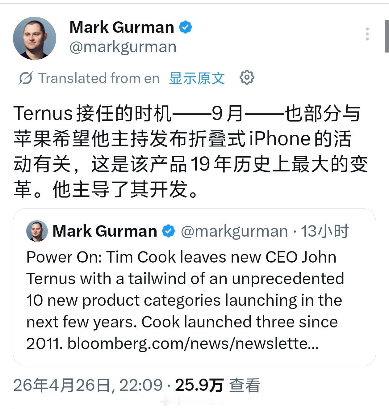 古尔曼爆料,未来数年内,苹果计划推出约 10 个全新产品品类,横跨智能家居、AI 穿戴设备及其他硬件领域,首个到来的,是今年 9 月发布的折叠屏 iPhone,由苹果新任 CEO 特努斯主导。