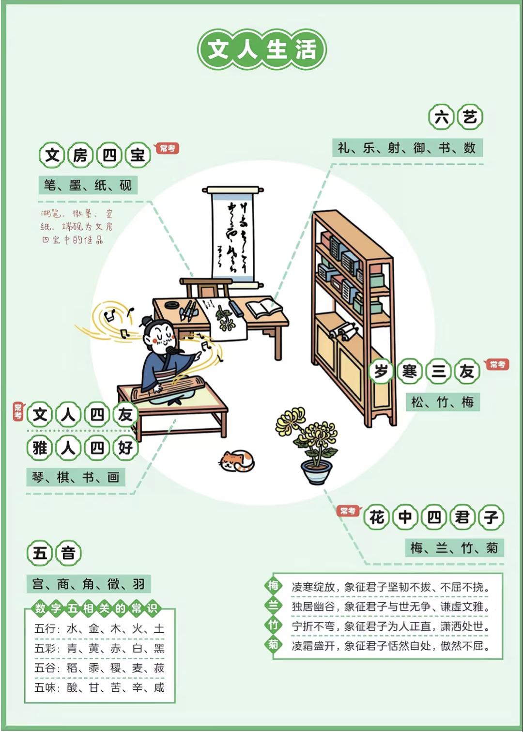 小学必看文学常识: “六艺”:礼、乐、射、御、书、数 “五音”:宫、商、角、徵、羽 “文房四宝”:笔、墨、纸、砚 “文人四友”:琴、棋、书、画 “岁寒三友”:松、竹、梅 “花中四君子”:梅、兰、竹、菊 语文必看知识点 语文知识图解