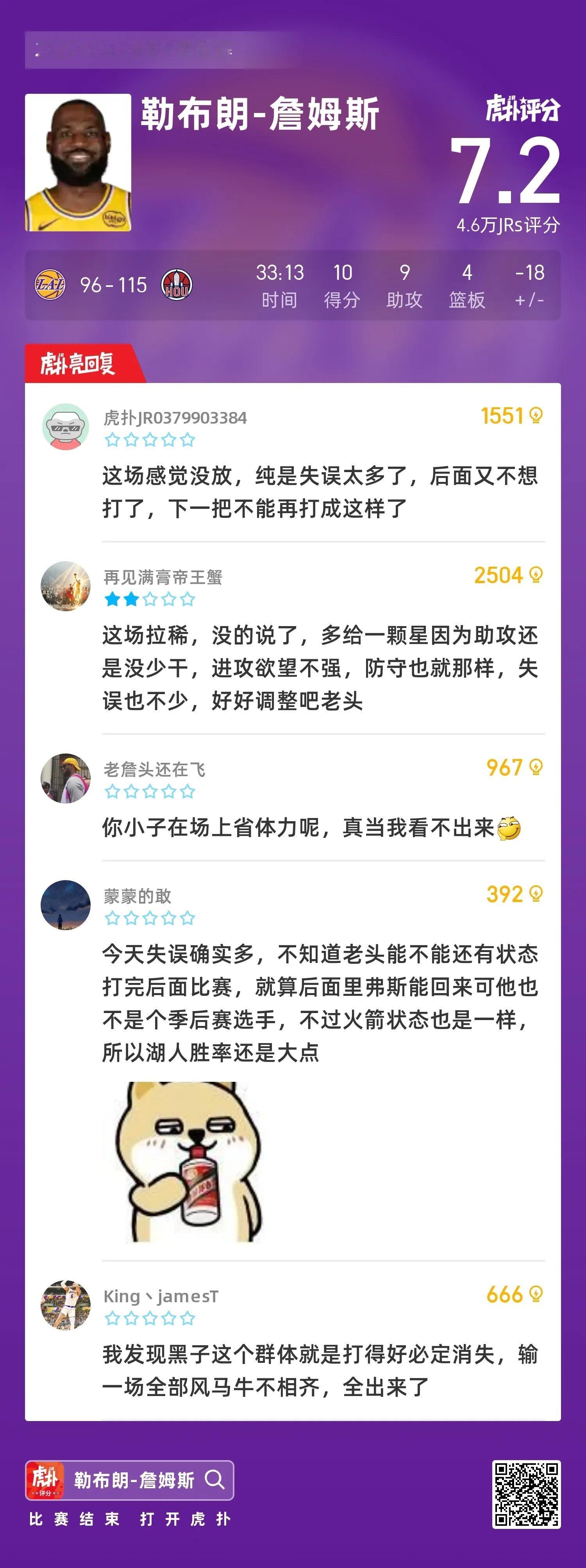 本场比赛,詹姆斯9投2中,三分3中0得到10分4篮板9助攻8失误。