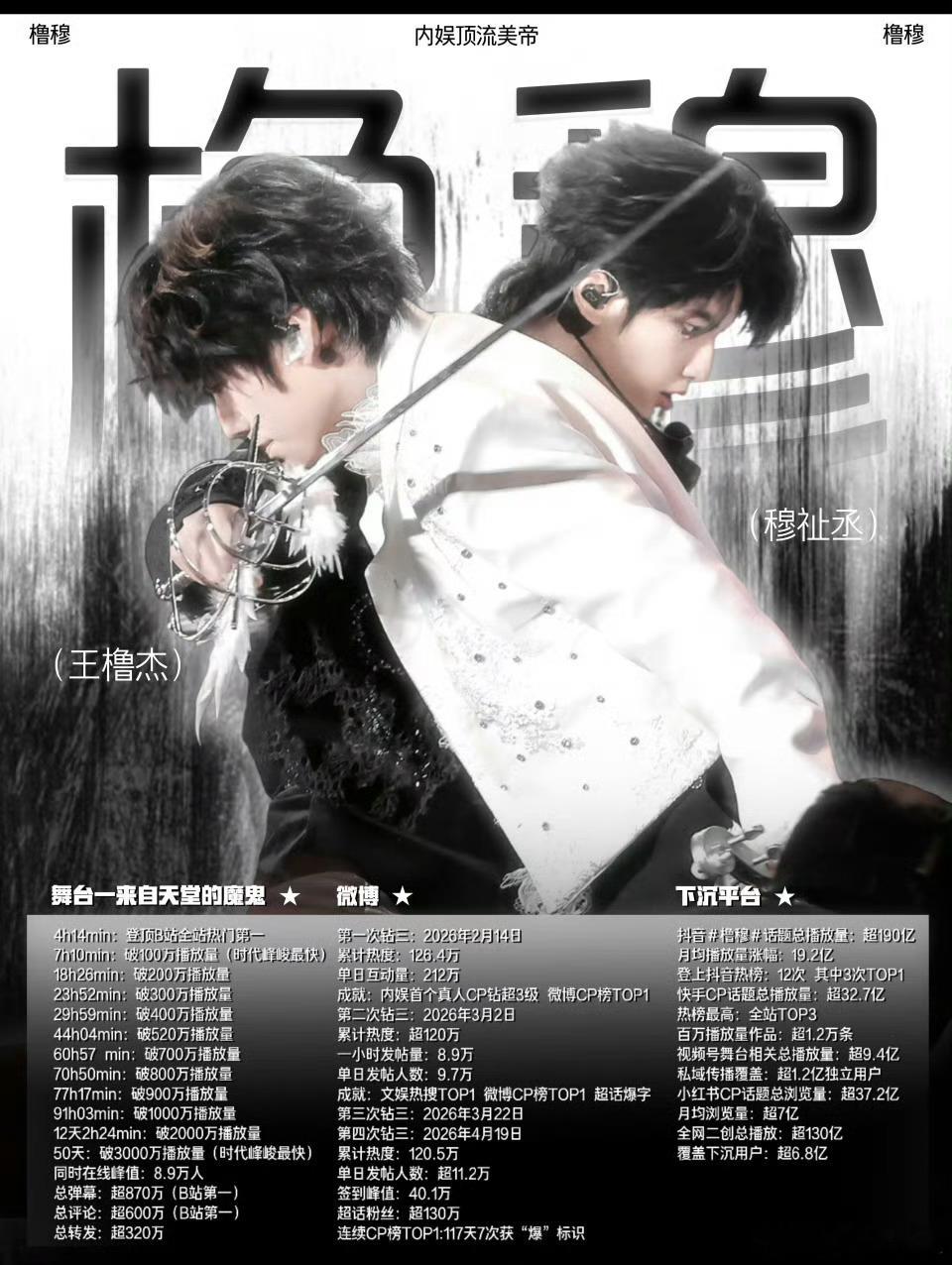 橹穆舞台播放量时代峰峻第二恭喜橹穆双人舞台官摄上线百天,斩获时代峰峻播放量榜第二🥳B站楼内史上亮眼成绩,更是队内首个且唯一千万弹幕舞台!百天在线人数峰值15w+,超强活人盘实力认证。