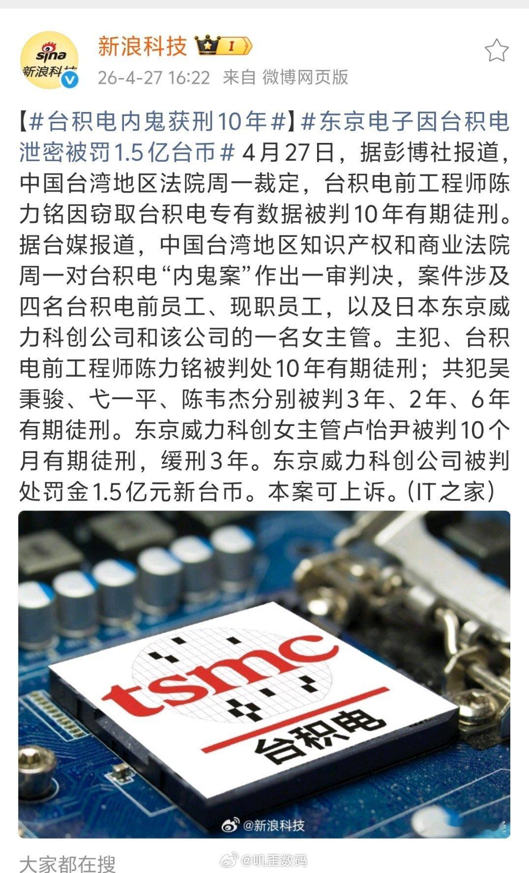 台积电内鬼获刑10年台积电内鬼获刑10年,还涉及到了日本的一名女主管。其实最大的内鬼,可能在美国,不然怎么会被骗去美国建厂,补贴又没拿到……