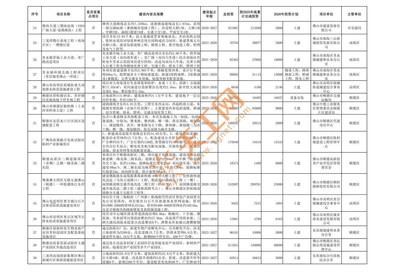 🔥佛山 2026 年重点项目清单出炉!383 个项目, 总投资超 2.7 万亿,2026 年计划投资 4047.8 亿! 挑几个重点说: ✅佛山新机场大道一期:机场配套关键通道,双向多车道设计,打通新机场交通动脉 ✅珠三角枢纽机场交通枢纽:市政配套土建预留,支撑机场高效运行 ✅一环联通珠江东岸工程:强化顺德与大湾区互联互通,跨江通道升级 ✅220 千伏城北输变电工程:保障禅城电力供应,支撑产业用电更多完整项目清单, 后续持续更新! 天工网AI签单管家佛山重点项目 佛山基建