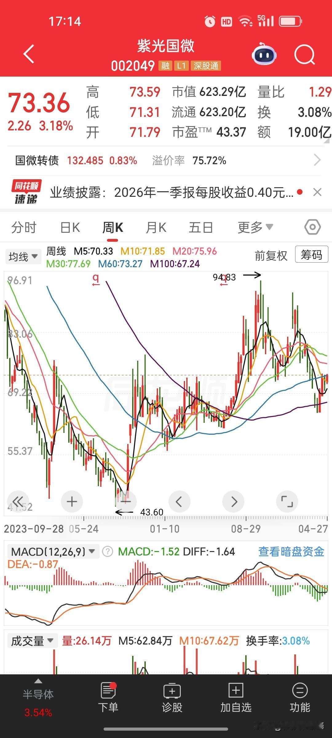 紫光国微(002049)点评:一季报高增验证复苏,半导体龙头的修复之路 一、基本面:业绩触底反弹,复苏趋势明确 1. 年报业绩:止跌回升,行业周期拐点显现 - 2025年归母净利润14.37亿元,同比增长21.86%,一扫2024年净利润腰斩(-53.43%)的颓势,标志着公司已经走出行业低谷。 - 利润回升的背后,是公司核心业务智能卡、特种集成电路的订单与毛利率改善,尤其是在军工、金融安全等领域的订单复苏,直接带动了业绩修复。 2. 一季报数据:高增超预期,复苏动能强劲 2026年一季报核心数据: - 归母净利润3.343亿元,同比大幅增长180.27%,增速远超市场预期,验证了行业复苏的持续性; - 高增长主要受益于特种集成电路订单放量、智能卡业务回暖,以及产品结构优化带来的毛利率提升,说明公司核心竞争力依然稳固。 3. 估值:处于历史中等区间,修复空间尚存 - 当前股价73.36元,对应市值623.29亿,市盈率TTM约43.37倍,较2024年业绩低谷时的估值有所修复,但对比半导体行业复苏周期的历史估值,仍有一定的修复空间。 - 随着业绩持续回暖,估值有望进一步向行业中枢靠拢。 二、技术面:从高点回落,震荡筑底阶段已过 1. 股价走势:高位回调后企稳,进入震荡修复通道 - 股价从94.83元的高点回落,最低下探43.60元,当前在73元附近震荡,已经走出明确的底部修复形态; - 周线图上,股价已经突破5周、10周均线,目前在20周、30周均线附近震荡,上方强压力位在77元附近,下方支撑位在67元(100周均线)。 2. 量能与资金面:成交活跃,资金关注度回升 - 近期日均成交额约19亿,换手率维持在3%左右,说明市场资金关注度明显回升,增量资金正在进场布局; - MACD指标处于零轴下方,DIFF线向上靠近DEA线,绿柱持续缩短,属于下跌后的弱势反弹阶段,尚未形成明确的金叉信号,短期震荡后有望延续修复趋势。 三、核心逻辑与风险点 1. 核心逻辑:行业复苏+国产替代+业绩修复三重驱动 - 行业复苏:全球半导体行业周期触底,国内半导体需求回暖,作为国内特种IC、智能卡领域的龙头,公司直接受益于行业复苏; - 国产替代加速:在军工、金融安全等关键领域,国产替代趋势明确,公司作为行业龙头,订单与市占率持续提升; - 业绩修复:一季报高增验证了复苏逻辑,随着后续订单持续放量,业绩有望继续保持增长,推动估值修复。 2. 主要风险点:需要警惕的不确定性 - 行业复苏不及预期:若半导体行业复苏节奏放缓,下游订单不及预期,可能影响公司业绩增长; - 市场竞争加剧:智能卡、特种IC领域竞争加剧,可能导致订单分流、毛利率下滑; - 股价波动风险:当前半导体板块受市场情绪影响较大,股价波动较为剧烈,短期或面临回调压力。 四、操作建议(风险厌恶型投资者参考) 1. 短期:震荡蓄力,关注70元支撑位 当前股价在73元附近震荡,属于修复过程中的正常回调,只要不跌破70元支撑位,修复趋势就不会被破坏,可继续持有观望。 2. 中期:重点跟踪二季度业绩,验证复苏持续性 一季报高增验证了复苏逻辑,后续二季度业绩能否延续增长,是判断修复空间的关键。若增速持续,股价有望突破77元压力位,打开上行空间。 3. 长期:国产替代与行业复苏下的配置良机 作为国内特种IC和智能卡领域的龙头,公司长期受益于国产替代和行业复苏,当前业绩修复+估值修复的双重驱动下,具备长期配置价值,适合作为底仓长期持有。 一句话总结 紫光国微一季报高增超预期,验证了行业复苏逻辑,股价也从高位回落企稳,进入震荡修复通道,短期震荡蓄力,中期关注二季度业绩验证复苏持续性,长期具备国产替代与行业复苏的双重驱动,是半导体板块中值得关注的修复标的。 (信息来源:深交所、同花顺财经 以上内容均为个人观点与解读,仅供参考,不代表平台立场,也不构成任何投资或决策建议。