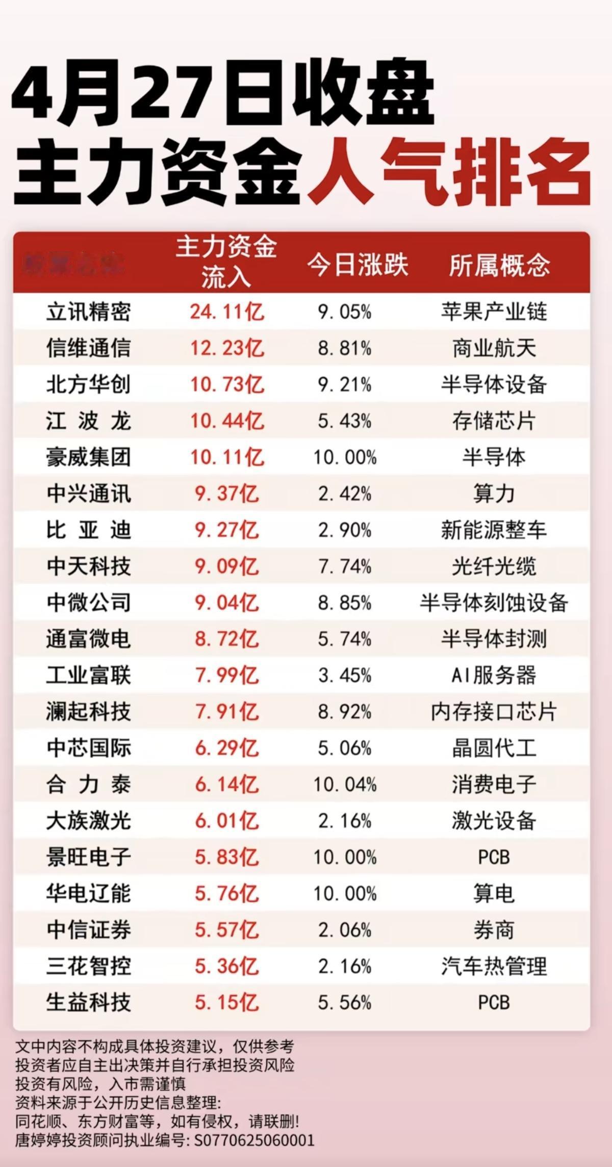 4.27周一收盘 主力大资金人气排名! 1.苹果产业链,消费电子 2.半导体设备 3.算力 4.光纤光缆 5.存储芯片
