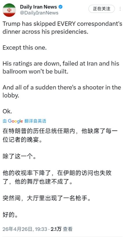4月26号晚上,《每日伊朗新闻》说了段话,翻译过来就是:特朗普当总统这么久,从没参加过记者晚宴,这次却破例去了。为啥破例?因为他最近太惨了——支持率掉得厉害,打伊朗也打输了,想建个白宫宴会厅撑面子也黄了。结果他一去,大厅里就冒出个持枪歹徒。 伊朗新闻没明说,但意思很明显:这刺杀大概率是特朗普自己演的,就是没实锤,不敢确定。 先跟大家说透,伊朗新闻不是直接骂特朗普自导自演,就是觉得这事太巧了,结合他最近的烂摊子,才猜的。 特朗普这次去记者晚宴,是真破例。他以前从不参加,就是怕记者问他难堪的问题,丢面子。 这次不光去了,刚坐下没多久,就出了刺杀的事,现场乱作一团,他被保镖拉走了。事后他说歹徒是“单独行动”,动机不明,但谁都觉得,这时机太巧了——偏偏在他最狼狈的时候出这事。 他是真狼狈。首先支持率掉得厉害,4月21号的民调显示,他的支持率才33%,比3月份少了5个百分点,创了重返白宫以来的新低。 为啥掉?就是因为他打伊朗,把美国老百姓坑了,油价涨得离谱,加油都心疼,大家都不满意他。 再就是打伊朗彻底输了。他本来想速战速决,结果伊朗根本不服软,还封锁了石油运输的要道,全球油价暴涨,美国也跟着吃亏。 美军打了没多久,弹药就快耗光了,伊朗用便宜无人机,美国得用几百万的导弹去拦,越打越亏,盟友也不帮他,最后成了孤家寡人。 还有他想建的白宫宴会厅,花3亿预算,想装面子,结果被法官叫停了,说他没经过国会同意,没权利改白宫,他气得骂街也没用,这事彻底黄了。 大家想想,他这么惨,突然来个刺杀未遂,能帮他啥?太明显了——博同情、拉支持率、转移注意力。 美国人就吃这一套,政客被刺杀,大家会心疼,说不定就投票支持他了;而且大家一关注刺杀,就没人骂他打输伊朗、推高油价了。 还有几个疑点,说出来大家都能明白。一是他从不参加晚宴,偏偏这时候去,刚去就出事,太刻意;二是歹徒没伤人,他也没危险,就像演的;三是事后他立马开记者会,还说要加强安保,想借着这事重新建宴会厅,太明显了。 当然,咱也不能瞎猜,伊朗新闻也只是暗示,没有实锤,美国官方也说歹徒是单独行动,还在调查。但结合特朗普的处境,这事真的太巧了。 其实美国政客都爱搞这套,为了拉选票、转移注意力,啥戏都能演。特朗普现在急得不行,啥办法都想试。 不管这刺杀是不是他演的,他的烂摊子都是自己搞出来的,就算靠演戏暂时挽回支持率,老百姓日子过不好,也骗不了人。