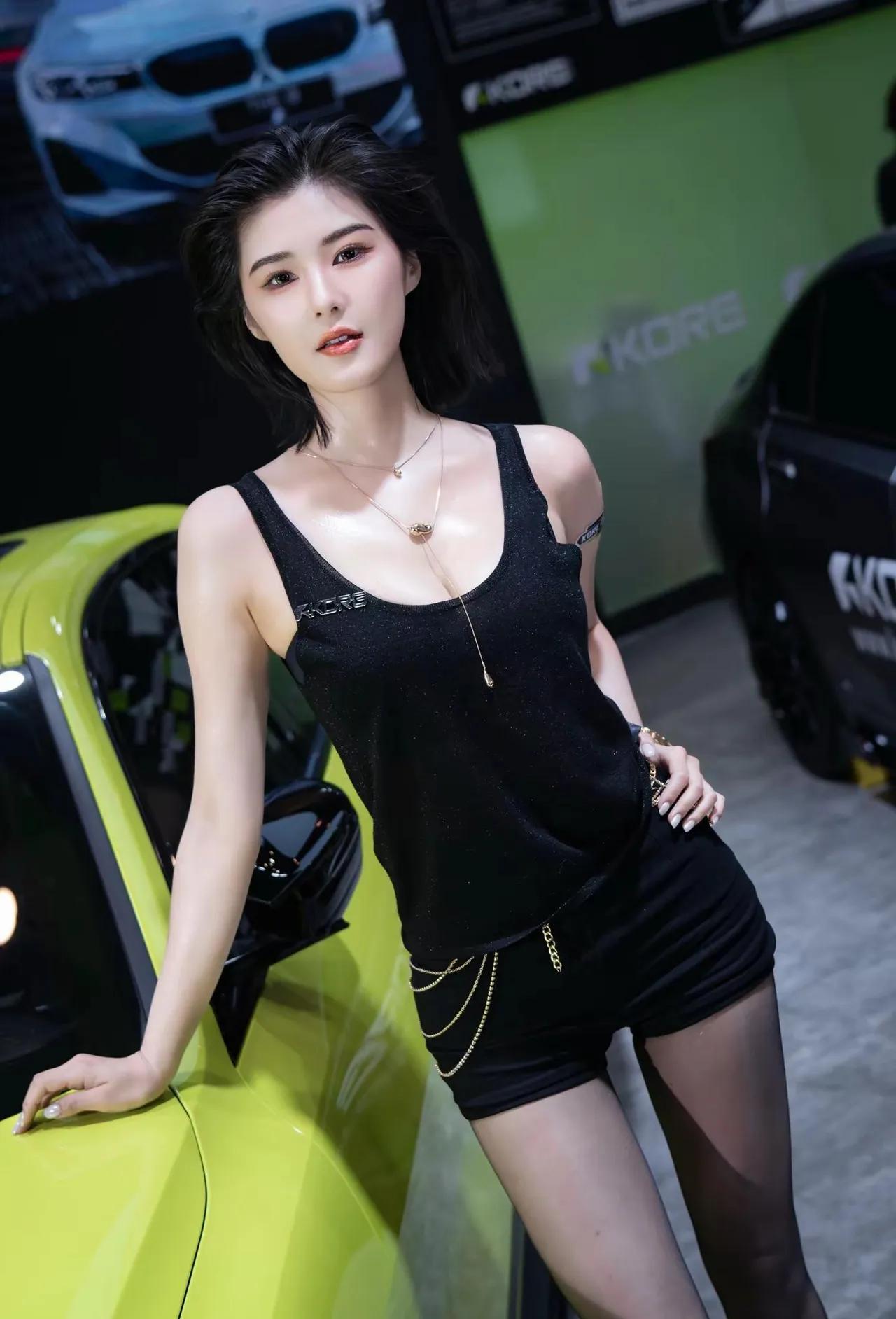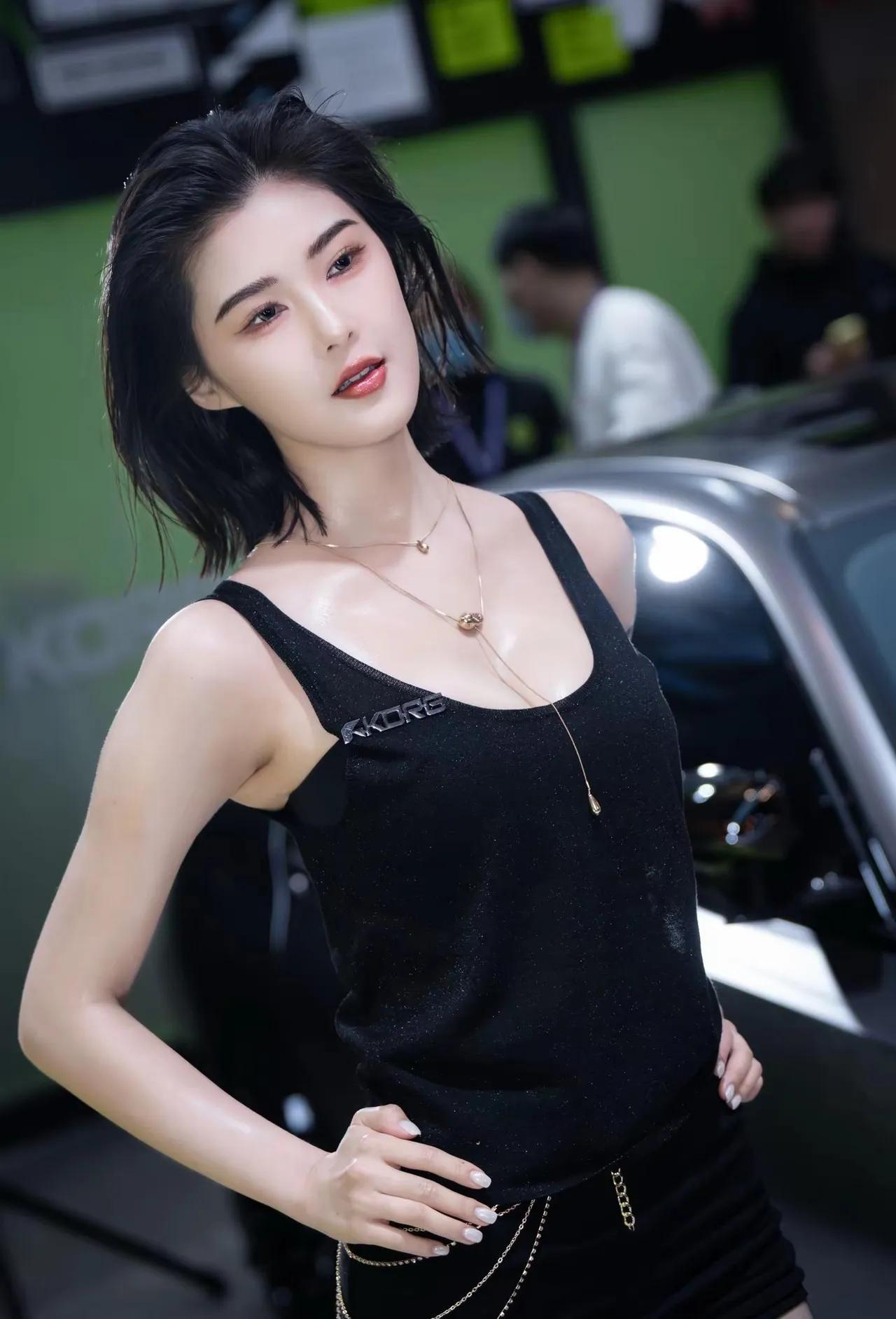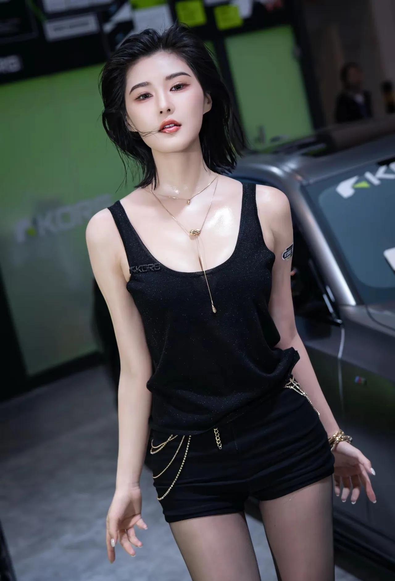 黑色背心搭配链条装饰,性感又酷炫!车展程儿[给力]
