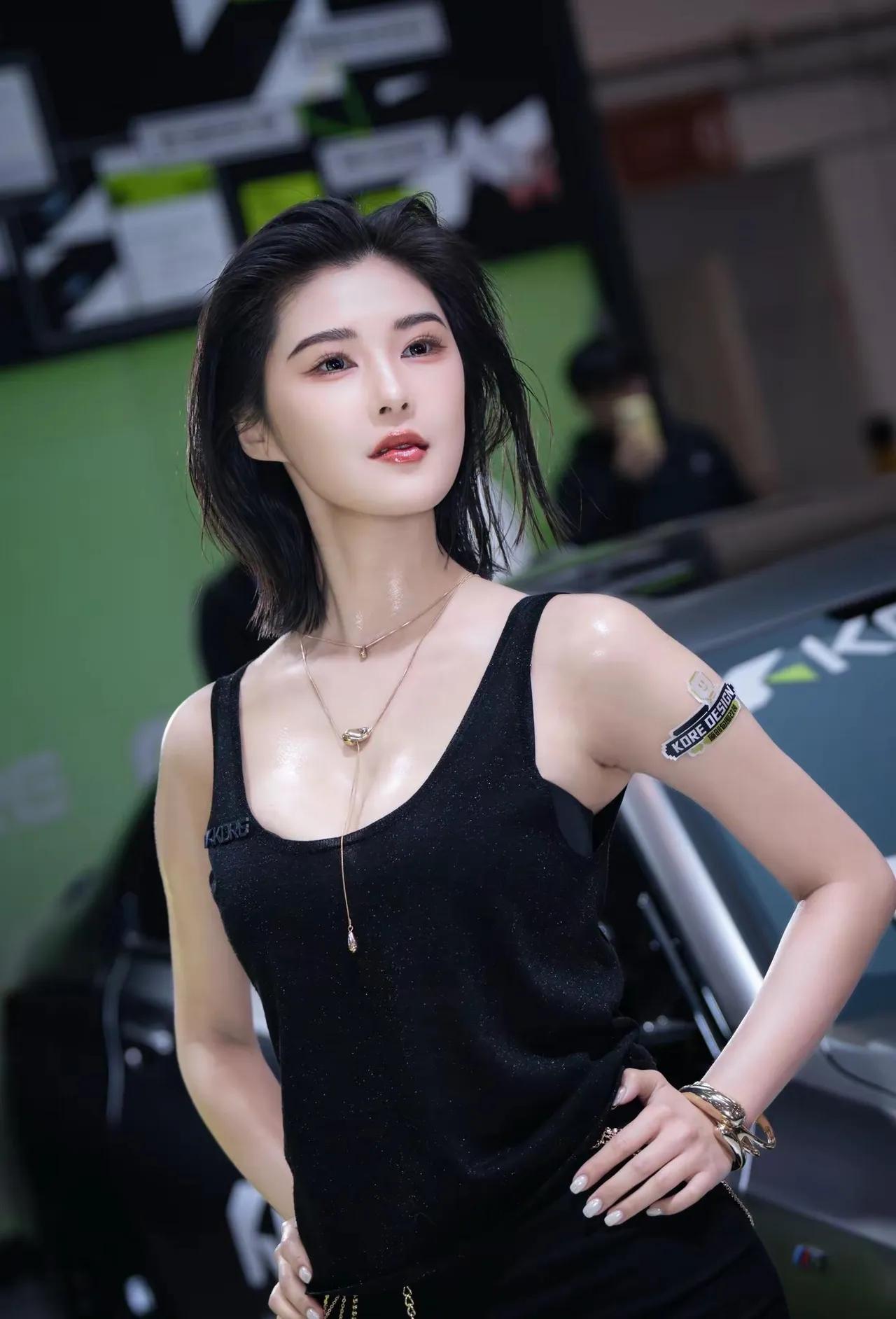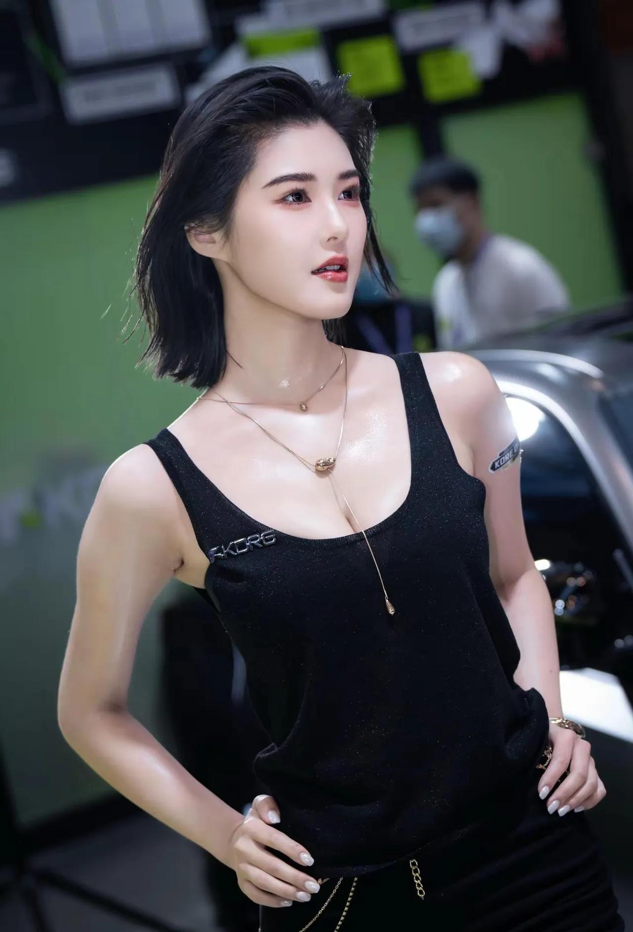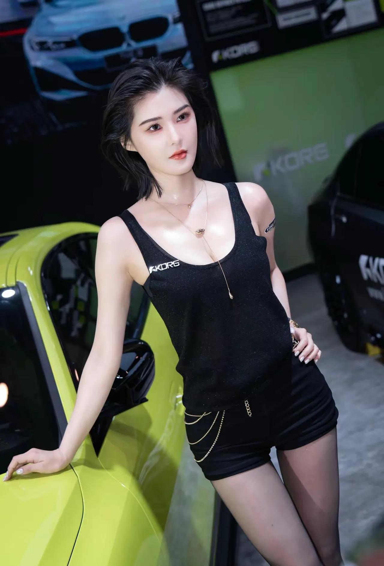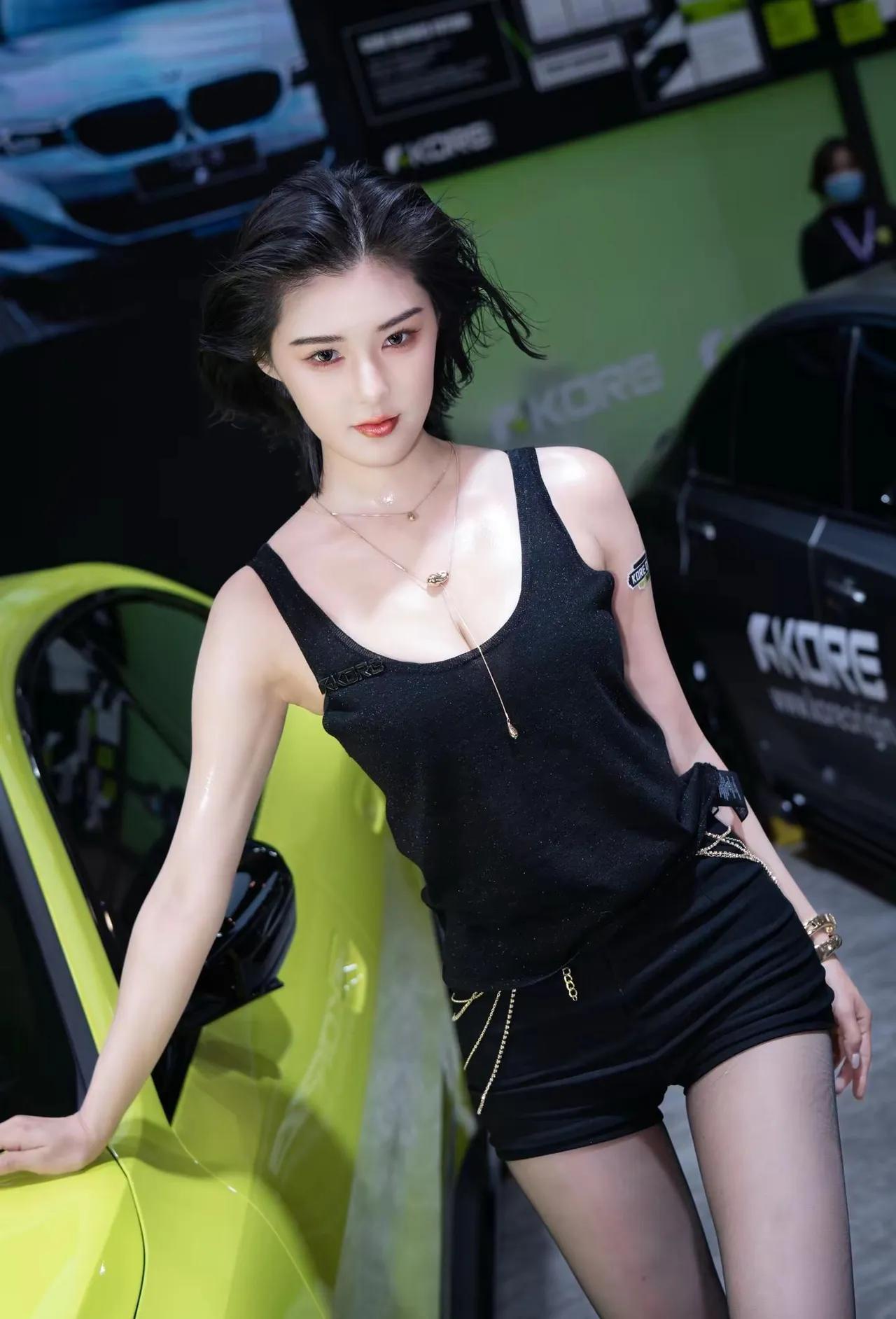 黑色背心搭配链条装饰,性感又酷炫!车展程儿[给力]