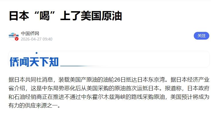 一艘油轮驶入东京湾,日媒欢呼不再担心中方卡脖子,依我看,炼厂应该要沉默了!故事得从一艘名叫“OTIS”的油轮说起,四月底,这艘大家伙载着美国德克萨斯轻质原油,漂了三十五天,绕了一个大圈,终于停进了东京湾。 这在一些日本媒体看来,可是天大的喜讯,你看,中东那边不太平,霍尔木兹海峡随时都可能出状况,日本超过九成的石油都得从那儿过,这根能源生命线实在是太脆弱了。 现在好了,美国老大哥的油来了,还是绕开风险区送来的,这不就是能源供应的“双保险”嘛!从此,能源安全多了一条路,这调子唱得那叫一个响亮。 然而,就在媒体一片欢腾的时候,真正要处理这些原油的日本炼油厂,却一个比一个安静,这种反常的沉默背后,其实是一本难念的经,一本写满了技术壁垒和经济账本的经。 炼油厂不是一个什么油都能吃的“大胃王”,它其实很“挑食”,日本的炼油体系,绝大多数都是几十年前,也就是上世纪六七十年代建起来的。 当时的设计和巨额投资,从管道的口径到反应塔的高度,每一个螺丝钉都是为了精准处理来自中东的原油。 中东的原油有什么特点?简单说就是“中质含硫”,品质没那么好,杂质多,处理起来麻烦,所以需要配备大量复杂的脱硫设备。 日本的炼油厂几十年来,就是靠着这套“重装备”,把廉价的中东原油吃干榨净,做成各种高价值的油品。 现在问题来了,美国送来的德州原油,是典型的“轻质低硫”甜油,这就像你几十年来一直吃惯了粗粮,肠胃也适应了,突然让你天天改吃精细的西餐,不闹毛病才怪。 把这种轻质原油直接灌进为重质油设计的设备里,会出大问题,行话叫“淹塔”,就是炼油塔的“天花板”会因为压力过大而超负荷,整个生产线都得降速,甚至停摆。 最新的数据也印证了这一点,今年四月,日本炼油厂的平均开工率已经掉到了百分之七十以下,远低于正常水平,这说明,油是运到了,但工厂“消化”不了,效率大打折扣。 炼油厂的目标不是简单地把原油变成汽油,而是要根据市场需求,生产出特定比例的各种产品,日本的工业和运输业最需要的是什么?是柴油和航空煤油,这些被称为“中间馏分油”。 而日本的炼油厂经过长期优化,恰恰最擅长从中东原油里提炼出这些东西,可一旦换成美国轻质原油,虽然汽油和石脑油的产量会增加,但柴油和航空煤油的产出率会明显下降。 这就尴尬了,想要的东西没多,不那么急需的反倒出来一堆。 结果就是媒体还在欢呼供应渠道拓宽,日本政府那边已经开始盘算着要不要动用国家战略储备,来填补可能出现的柴油缺口。 所以,当那艘美国油轮靠岸时,日本炼油厂的沉默,不是因为迟钝,恰恰是因为他们太清醒了,他们是真正懂行的人,一眼就看穿了这场“盛宴”背后的巨大代价和隐患。 媒体的欢呼,更像是讲给外行听的宣传故事,而业界的沉默,才是对现实最真实的反应。 信息来源:中国侨网2026-04-27 09:40
