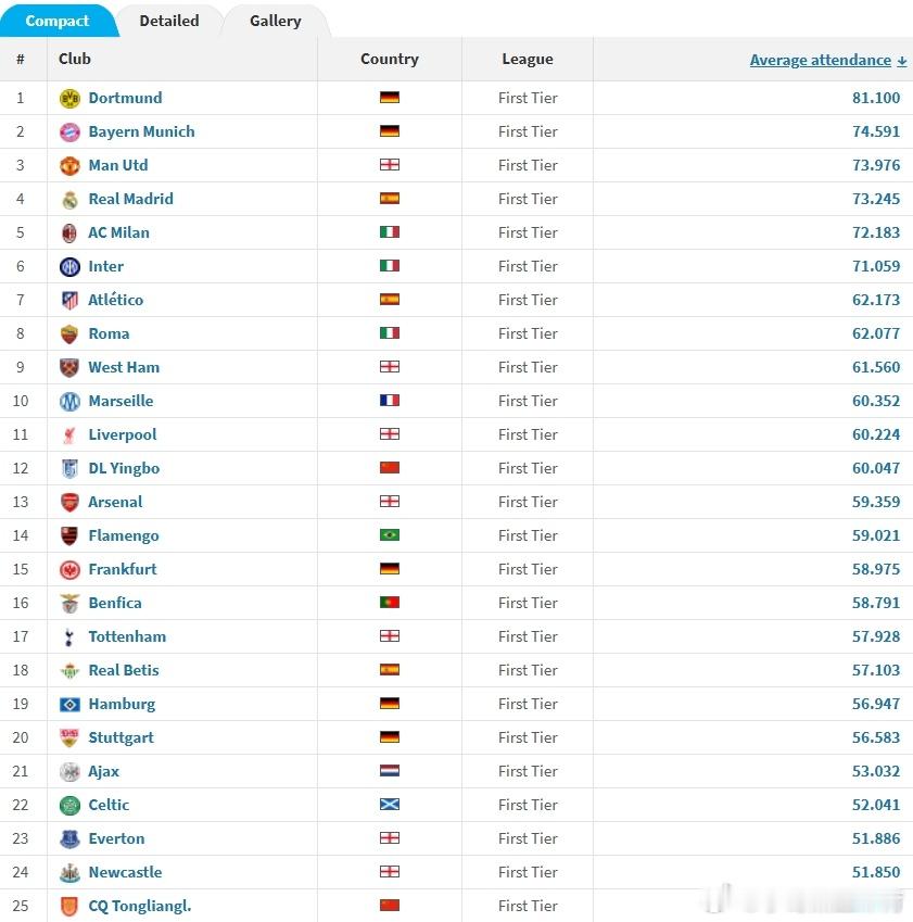 据德转数据统计,大连英博主场梭鱼湾的平均上座人数为60047人,位列全球第12,高于阿森纳酋长球场的59359人。此外,重庆铜梁龙主场平均上座51571人,位列全球第25。