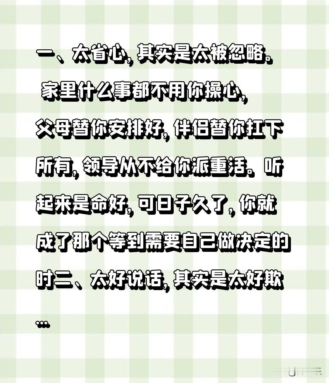 快停下!你以为是“福气”的这3件事,正在偷偷吸走你的好运! 有些事听着是好事,品着是甜头,可时间一长就变了味儿。你以为是在攒福气,其实是在漏好运。尤其这三件事,越早停下来,日子越顺。 一、太省心,其实是太被忽略。 家里什么事都不用你操心,父母替你安排好,伴侣替你扛下所有,领导从不给你派重活。听起来是命好,可日子久了,你就成了那个可有可无的人。等到需要自己做决定的时候,发现自己什么都不会,谁都不指望你。省心省到最后,省掉的是自己的分量。被人需要的能力,才是人这一生最扎实的底气。 二、太好说话,其实是太好欺负。 谁找你换班你都答应,谁借钱你都点头,谁让你帮忙你都说行。人人夸你脾气好、够意思,可有好事的时候,没人想得到你。因为大家都默认,你不需要,你不计较,你怎么样都行。太好说话的人,往往被放在最后考虑。你的善良必须带点棱角,别人才知道往哪儿放。 三、太稳定,其实是太停滞。 一份工作干十年,工资够花,活也不累,一眼望得到退休。亲戚朋友都说你福气好,稳定。可只有你自己知道,日子像一潭死水,表面平静,底下早就发臭了。稳定不等于停滞,真正的福气是手里有选择,不是只能待在一个地方不敢动。 省心过头就是被边缘,好说话过头就是没分量,稳定过头就是一潭死水。福气从来不是躺着等人伺候,是把日子攥在自己手里。 作者简介:职业撰稿人·文学鉴赏师·高级经济师·生活策略家 | 分享不焦虑的成长智慧:用心理学养心,用经 济学行事。每天早、晚各更新2个作品,感谢关注、点赞评价。