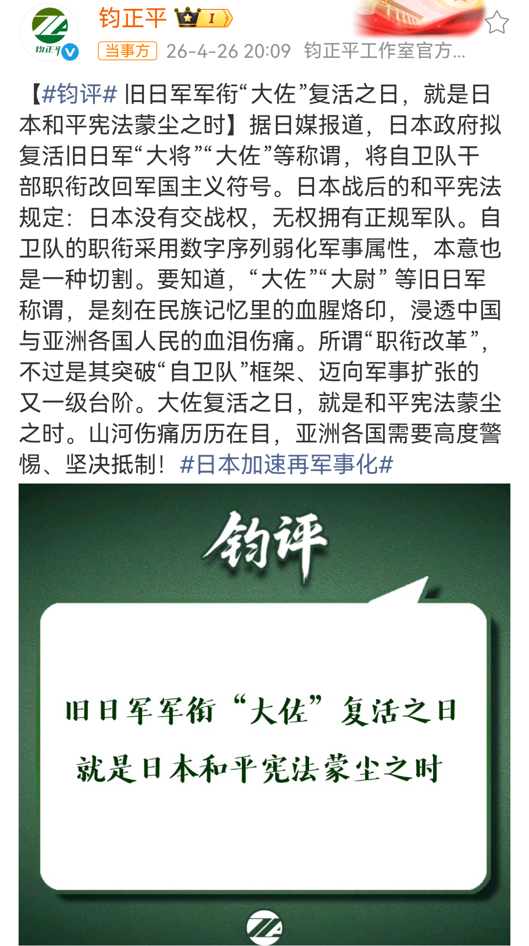 钧正平评日本大佐归来旧日军军衔“大佐”复活之日,就是日本和平宪法蒙尘之时。