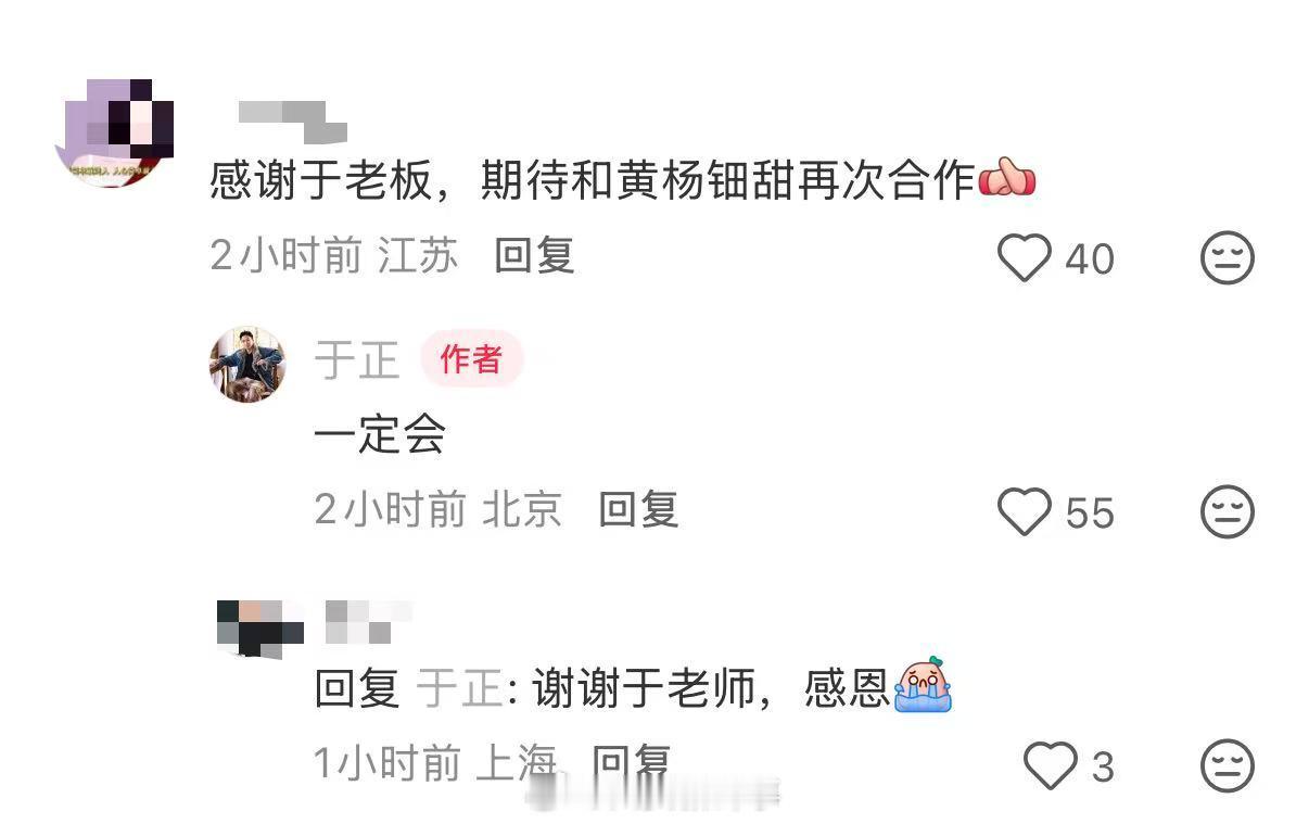 同日,有网友在著名编剧评论区留言称:“感谢于老板,期待和黄杨钿甜再次合作”,他回应称:“一定会!”