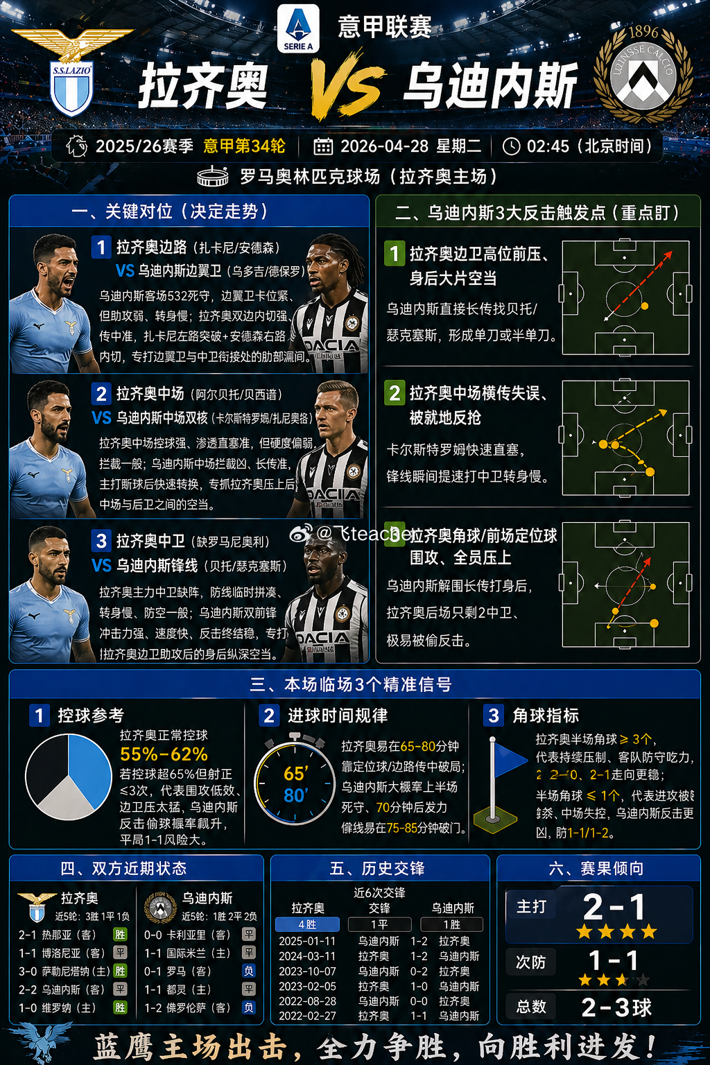 1. 拉齐奥边路(扎卡尼/安德森)VS 乌迪内斯边翼卫(乌多吉/德保罗)乌迪内斯客场532死守,边翼卫卡位紧、但助攻弱、转身慢;拉齐奥双边内切强、传中准,扎卡尼左路突破+安德森右路内切,专打边翼卫与中卫衔接处的肋部漏洞。