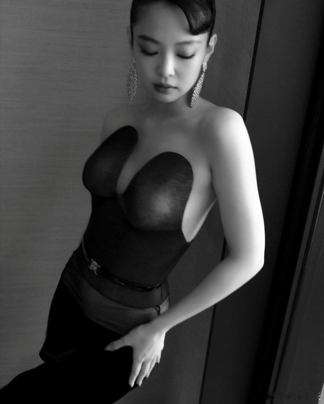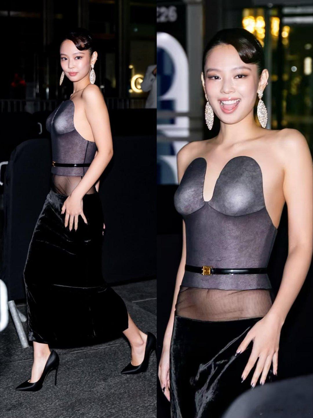 Jennie《时代》百大盛典穿搭解析Jennie欧美风时尚灵感解读一、造型品牌- 礼服:Schiaparelli 2026秋冬高定,黑色雕塑感紧身胸衣+丝绒长裙,中段透视拼接,皮革细腰带收腰。- 鞋履:Amina Muaddi 黑色缎面尖头高跟鞋。- 配饰:Schiaparelli 金属几何耳饰+细款颈链,极简克制。二、风格定位