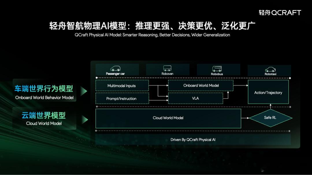 发布会上,轻舟智航正式发布云端与车端双引擎物理AI模型,采用世界模型+强化学习统一架构,打通数字与物理世界的研发范式,实现推理、决策、泛化三大能力升级。同时推出轻舟乘风MAX城市NOA方案,依托超500TOPS算力平台,以强AI大脑实现更贴近人类的驾驶决策与场景应对。