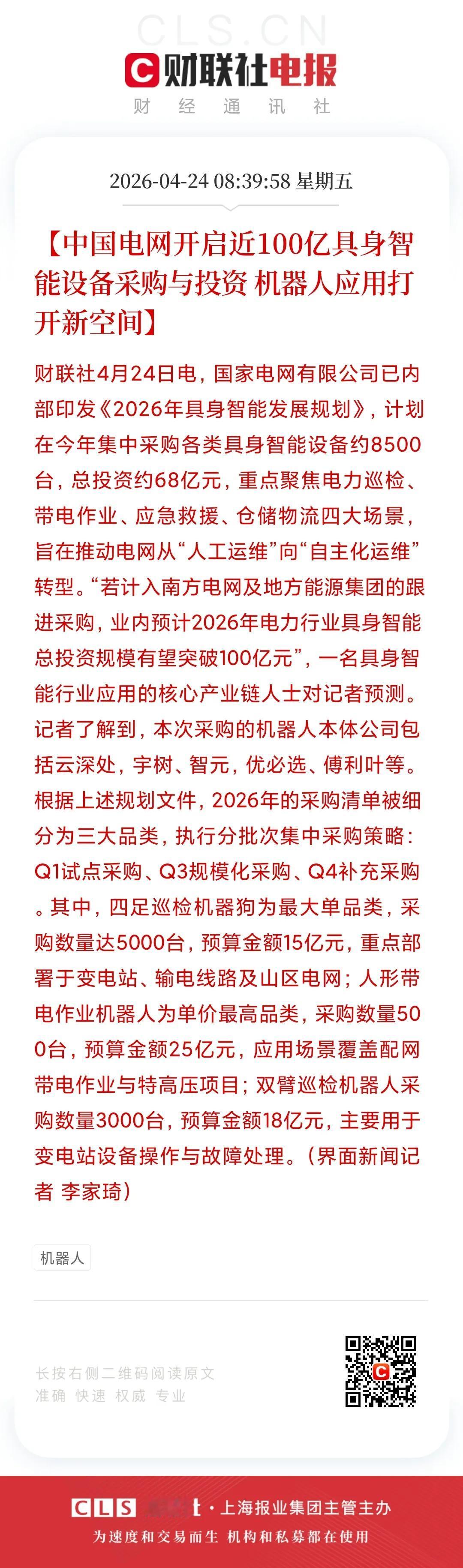中国电网将开展100亿左右的具身智能设备采购,这为投资以及未来机器人打开了应用场景,打开了新的发展空间!电网发展必然是从传统的人工服务与发展转向智能化机器人以及智能化设备的发展!就比如电缆线除冰,可以使用自动化机器人进行除冰!未来的人形机器人,电子狗机器人都将成为未来电网采购的设备!AI人工智能的发展推动了智能化的时代!机机器人更加便于维护电网!智能化的时代提供了更多的便利