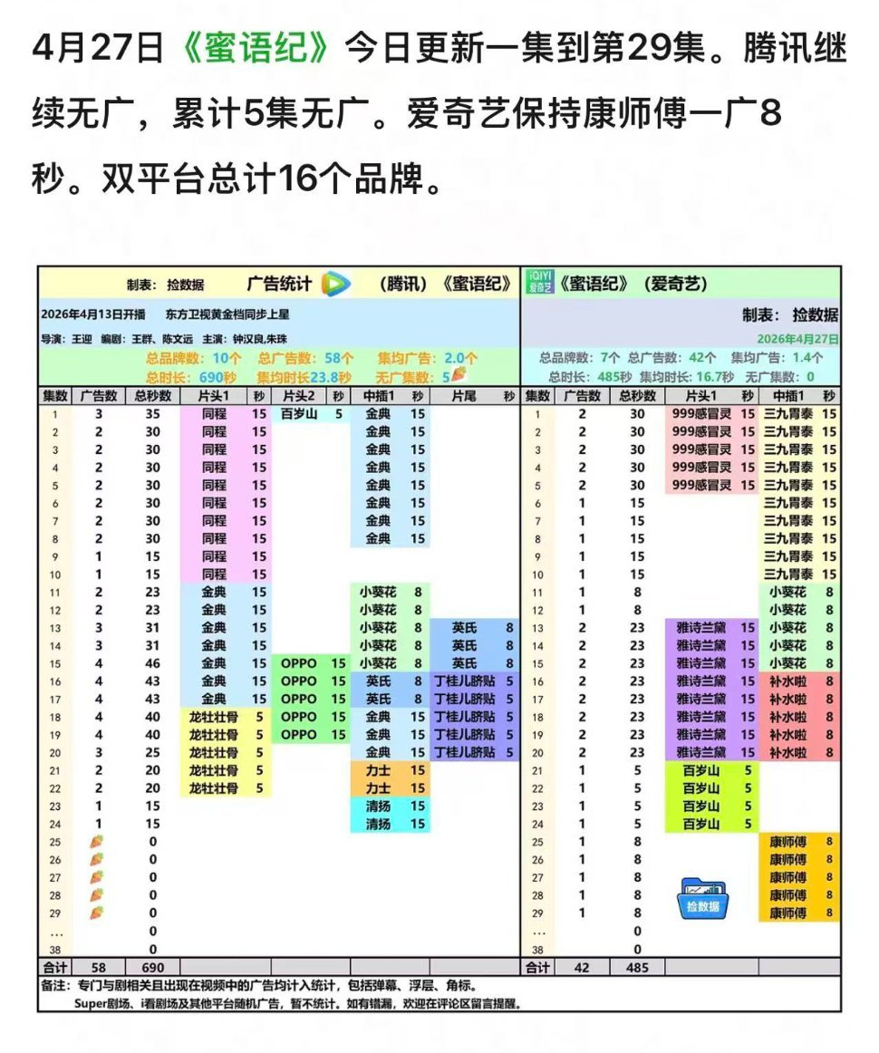 蜜语纪只剩一广剧集《蜜语纪》播出至第29集,广告投放数据更新:腾讯视频端已累计5集无广,爱奇艺端仅保留单品牌广告。