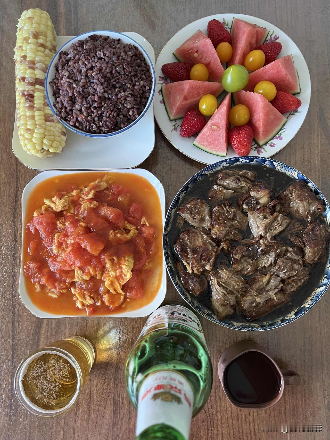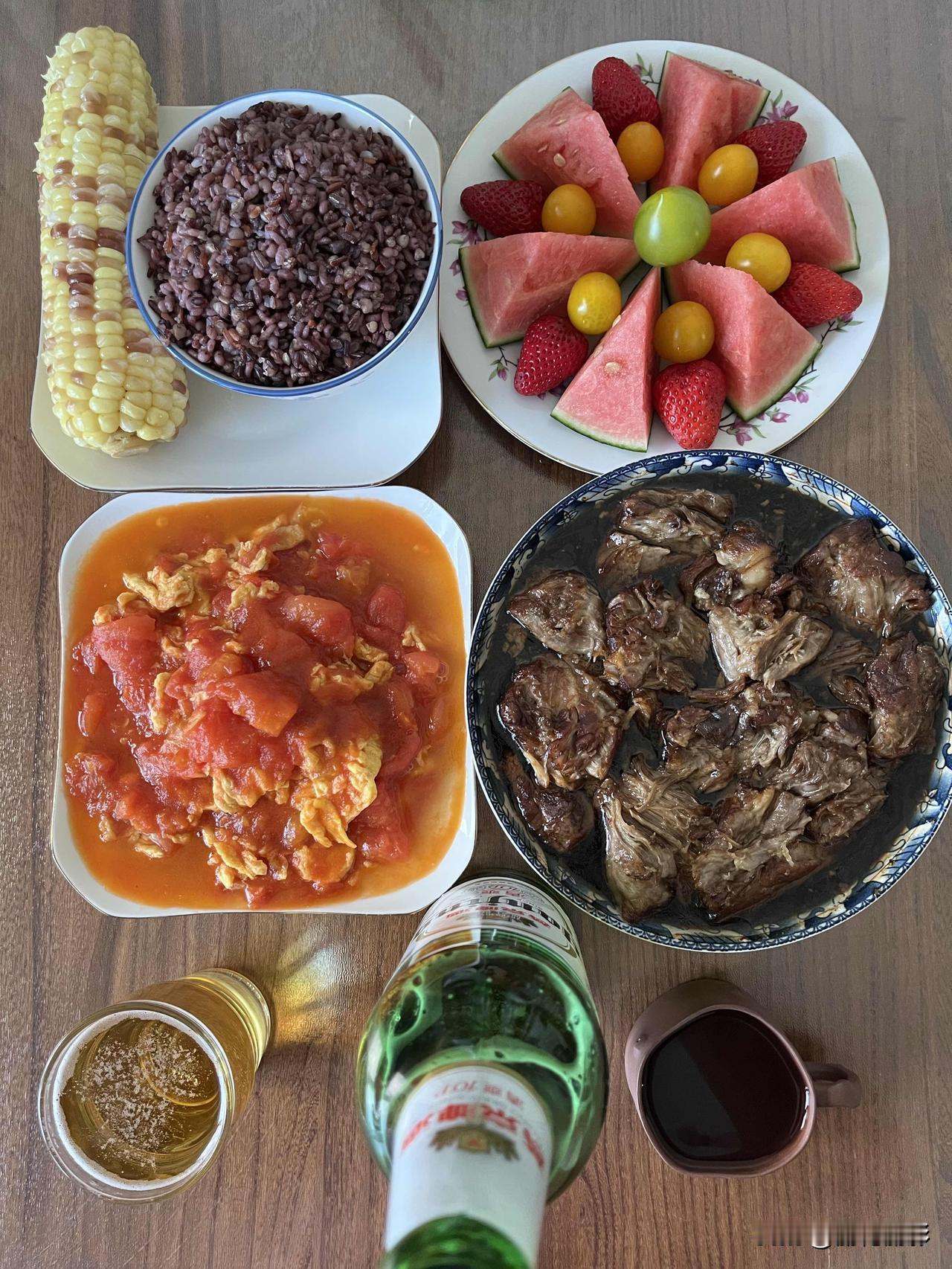 好友们晚上好!新周愉快,晚餐香香!今天的晚餐: 西红柿炒鸡蛋 蒸拆骨肉 杂粮饭 玉米 果盘 今天有些忙,下午新买的空调和洗衣机都到了,空调安装到快五点才完成。 这一天也累了,晚上做点儿省事儿的,把杂粮饭、拆骨肉和玉米一起蒸了,再炒一个鸡蛋西红柿弄个果盘,一顿简单美味的晚餐就齐了。 晚餐看着也不错吧,时间不早了,话不多说,开饭啦![大笑][大笑][大笑][大笑][大笑][大笑]
