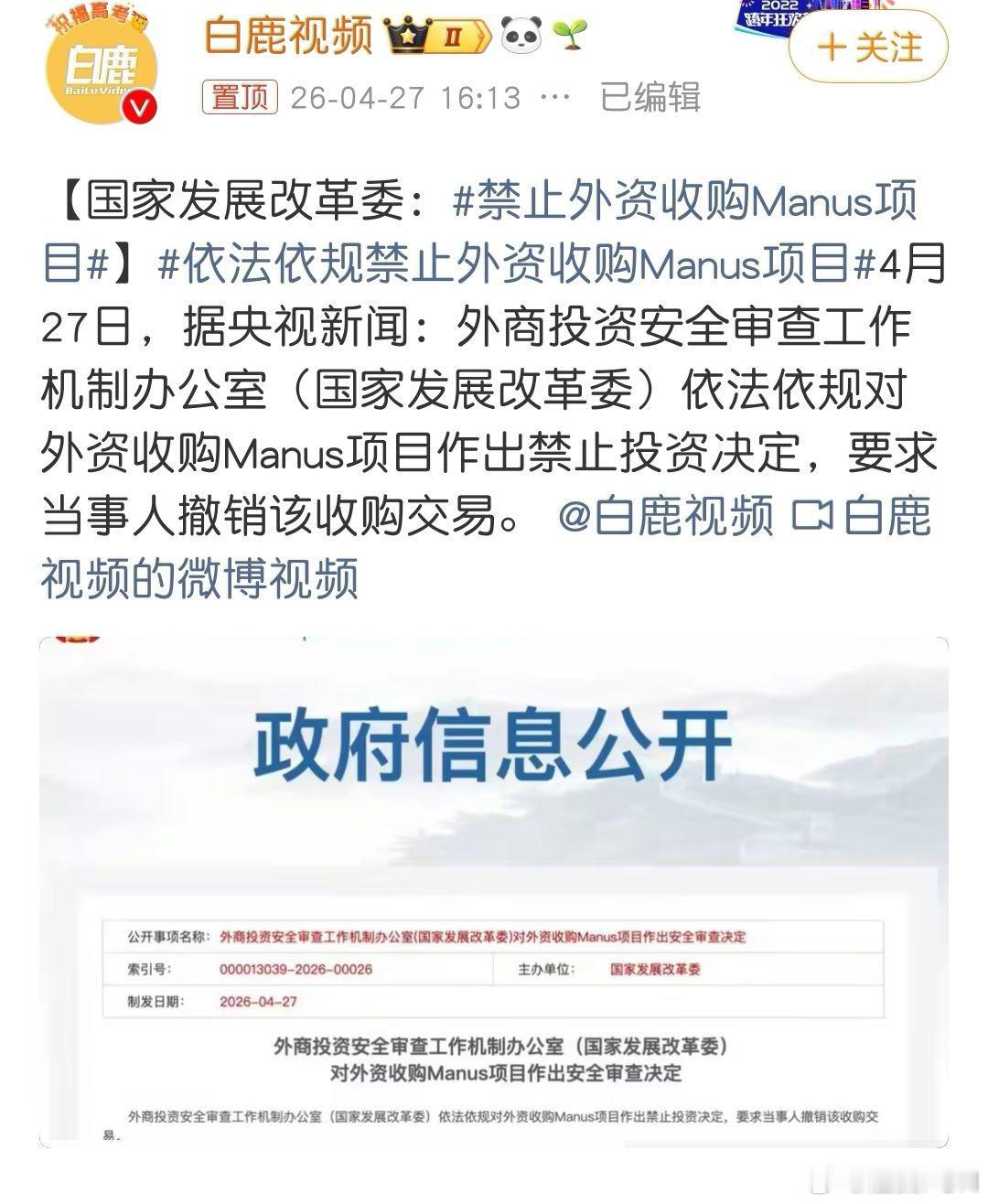禁止外资收购Manus项目干的漂亮!不能让外资为所欲为。