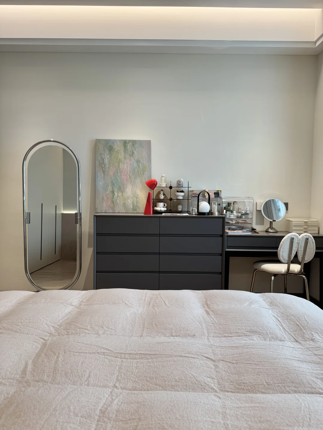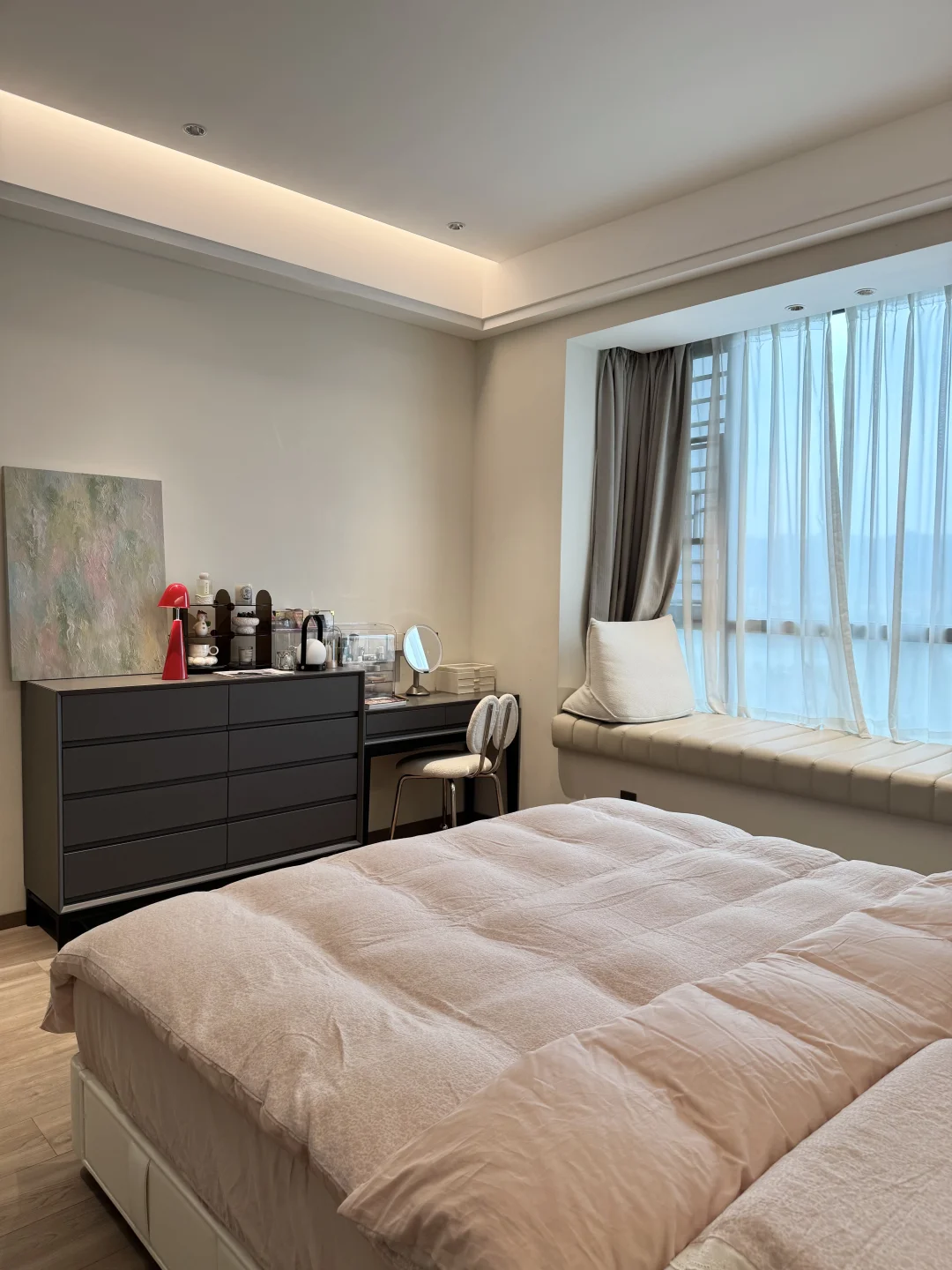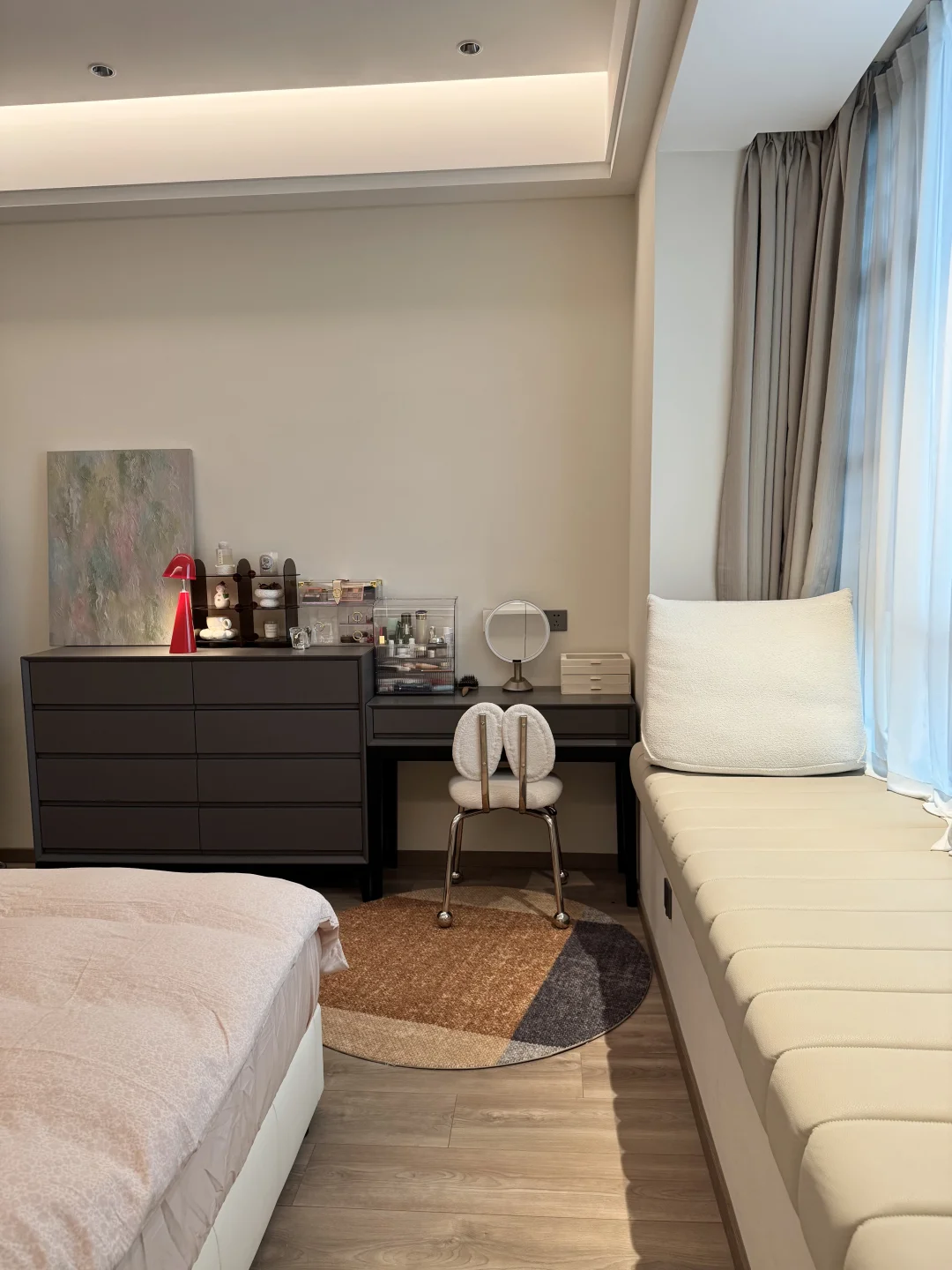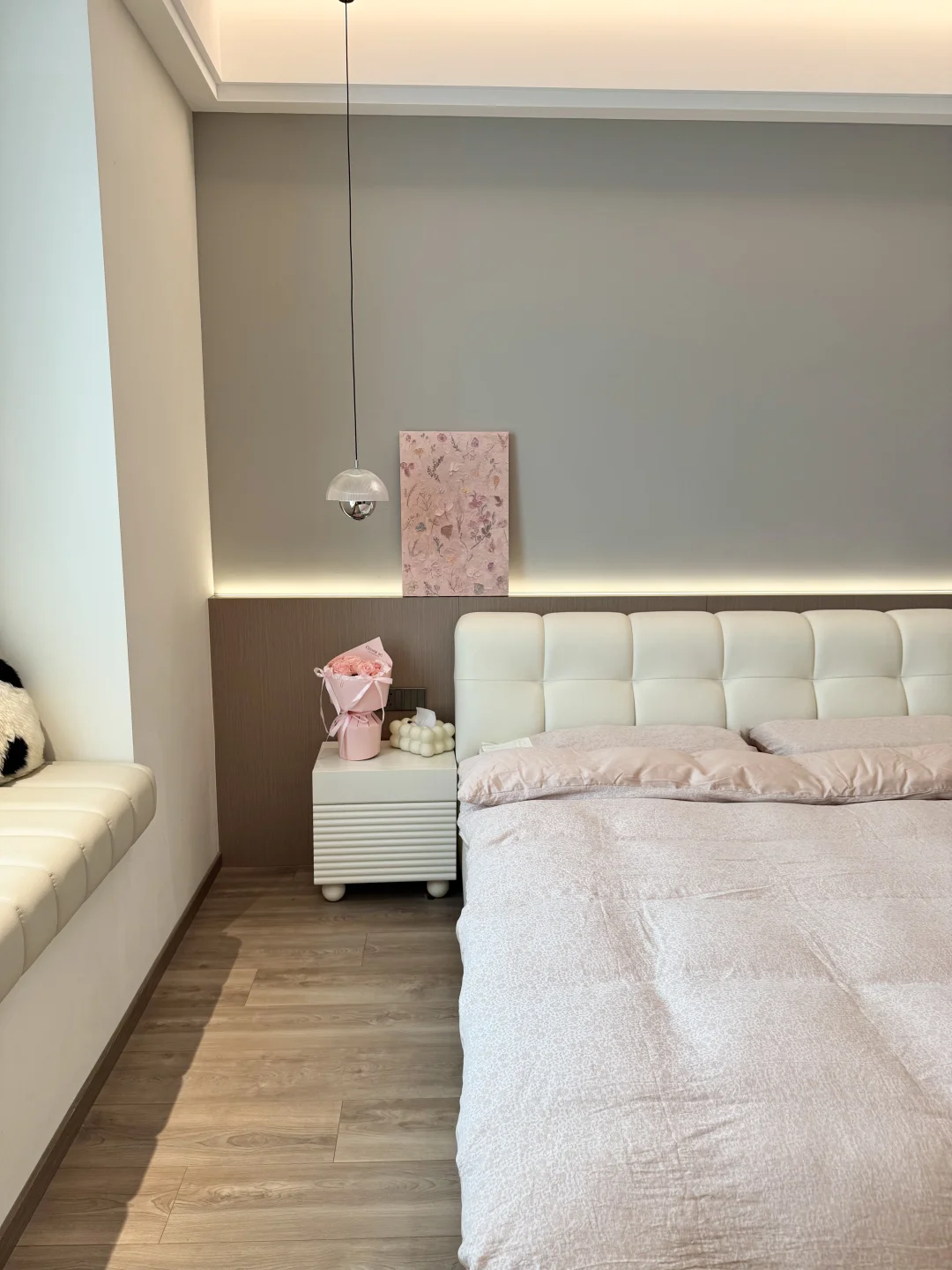 Hi~欢迎来到盐盐的家🏠 卧室是套房,有卫生间和衣帽间,一共21平~ 把我的主卧布置成喜欢的样子💛 床头做了个简约的半墙背景墙,打开灯光很有氛围感还很高级耐看 飘窗也可以坐着看看书看看风景~床尾摆放一组梳妆台加斗柜,床头柜上摆放一个赫本帽小台灯 把春天搬进卧室🌸铺上粉粉的床品,整个被温柔包裹着住了☁️ 精心布置的卧室很温馨又舒服,我可以宅一整天都不出门😌