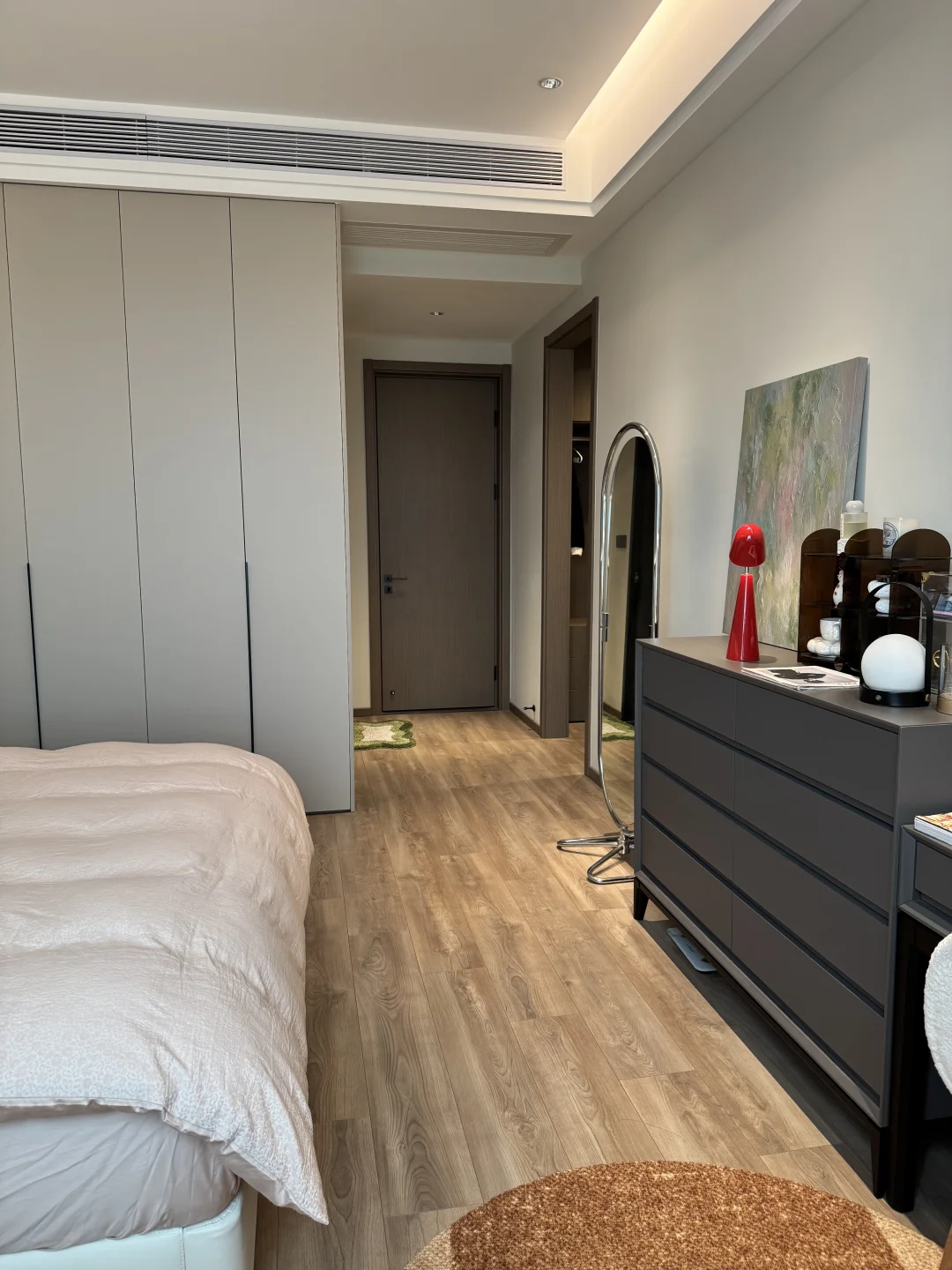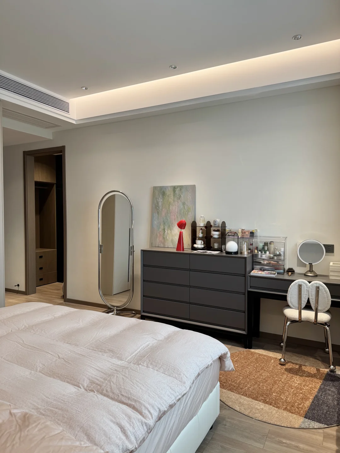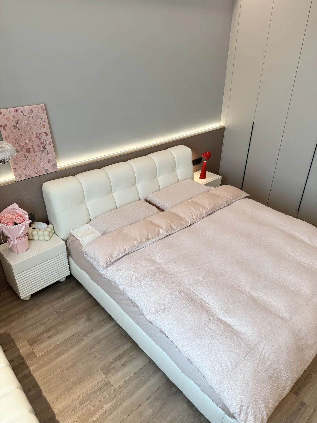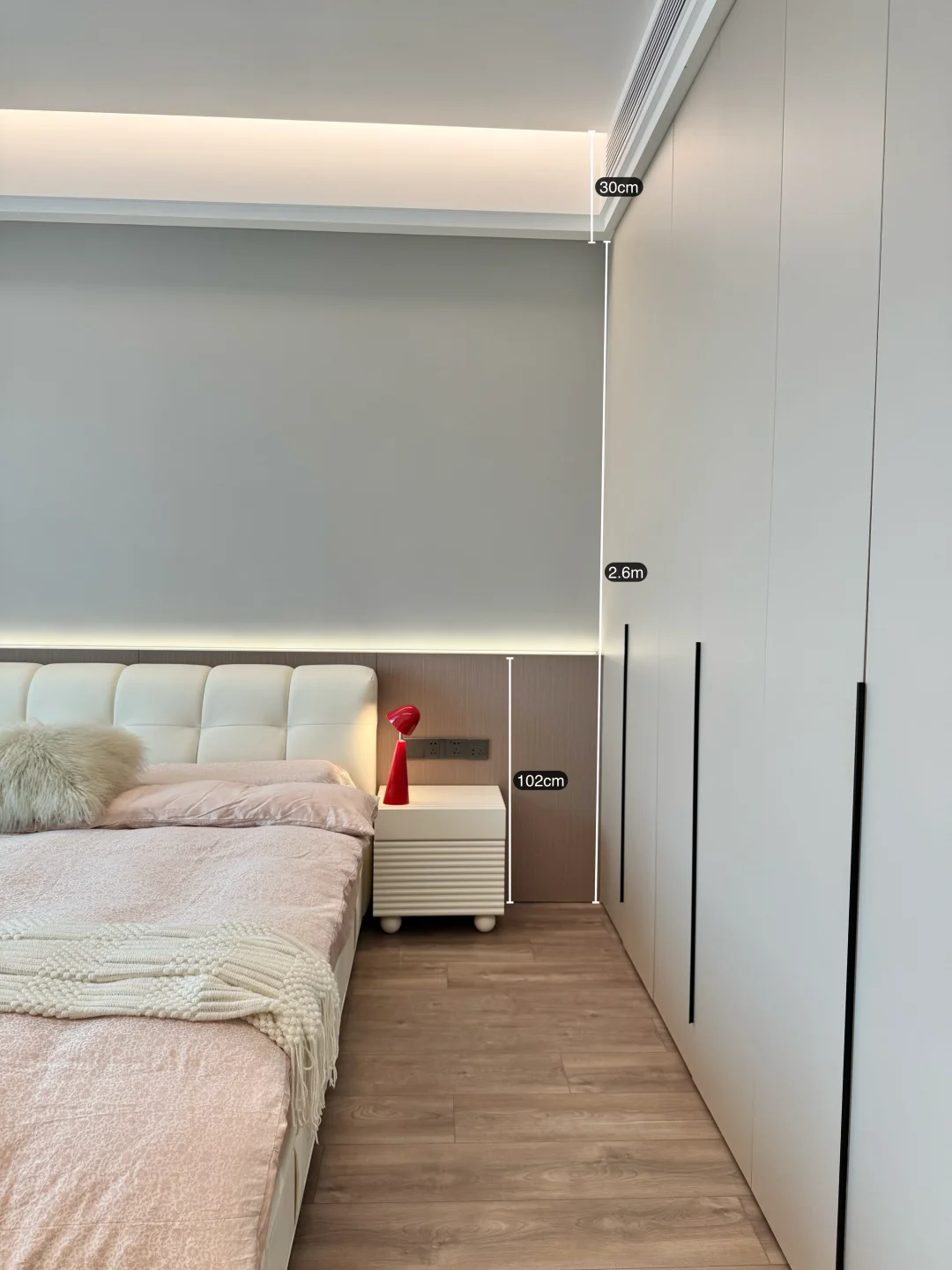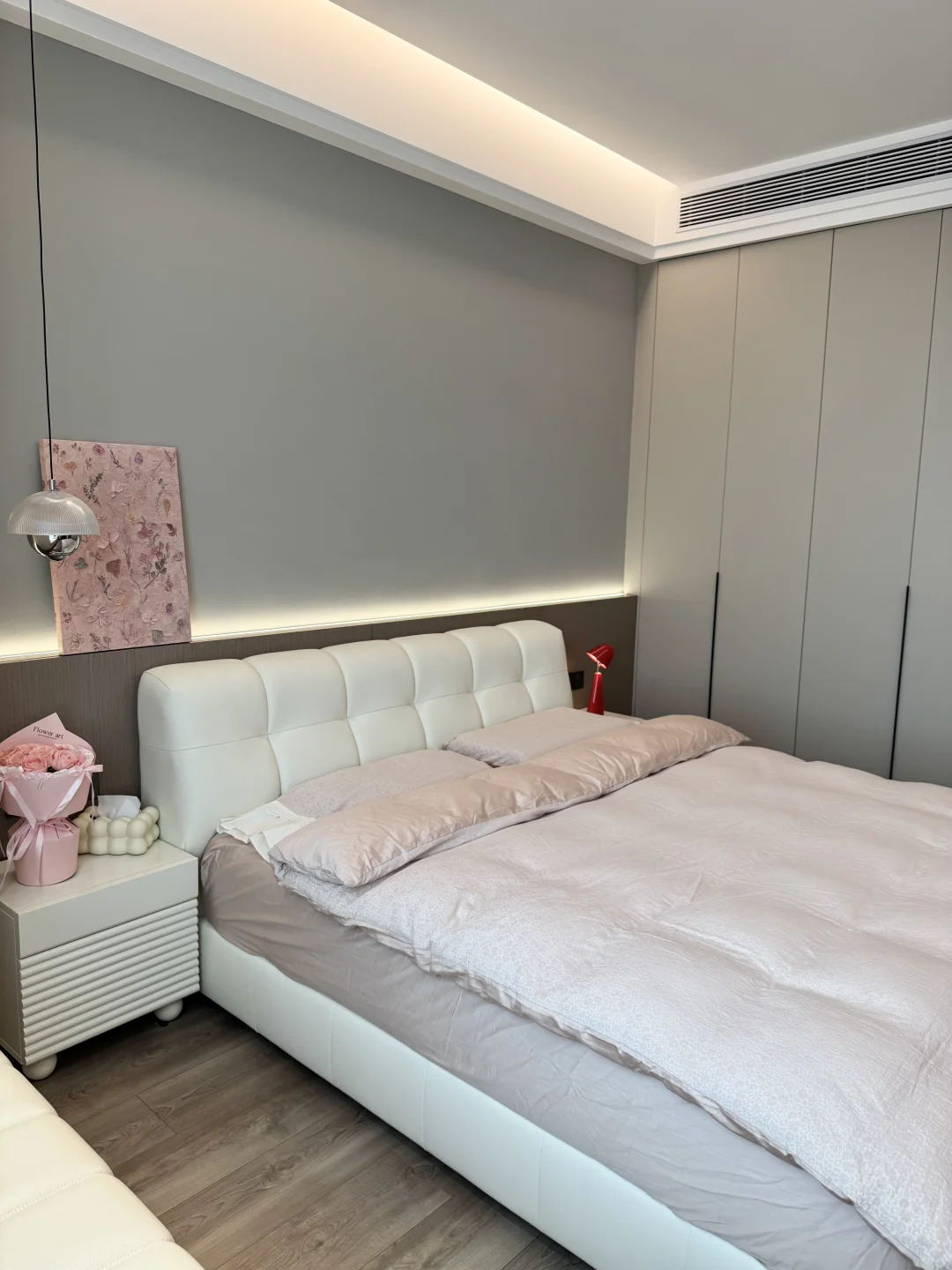 Hi~欢迎来到盐盐的家🏠 卧室是套房,有卫生间和衣帽间,一共21平~ 把我的主卧布置成喜欢的样子💛 床头做了个简约的半墙背景墙,打开灯光很有氛围感还很高级耐看 飘窗也可以坐着看看书看看风景~床尾摆放一组梳妆台加斗柜,床头柜上摆放一个赫本帽小台灯 把春天搬进卧室🌸铺上粉粉的床品,整个被温柔包裹着住了☁️ 精心布置的卧室很温馨又舒服,我可以宅一整天都不出门😌