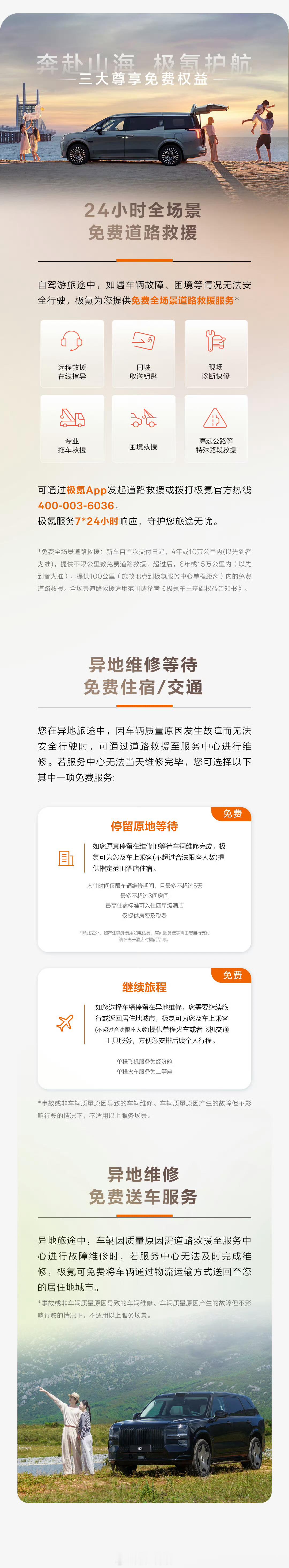 -24 小时全场景 免费道路救援;-免费上门换备胎;-异地维修等待 免费住宿/交通;-异地维修 免费送车服务;-极氪服务补给站 高速接力护航;-极氪驿站 自驾游全域保障。