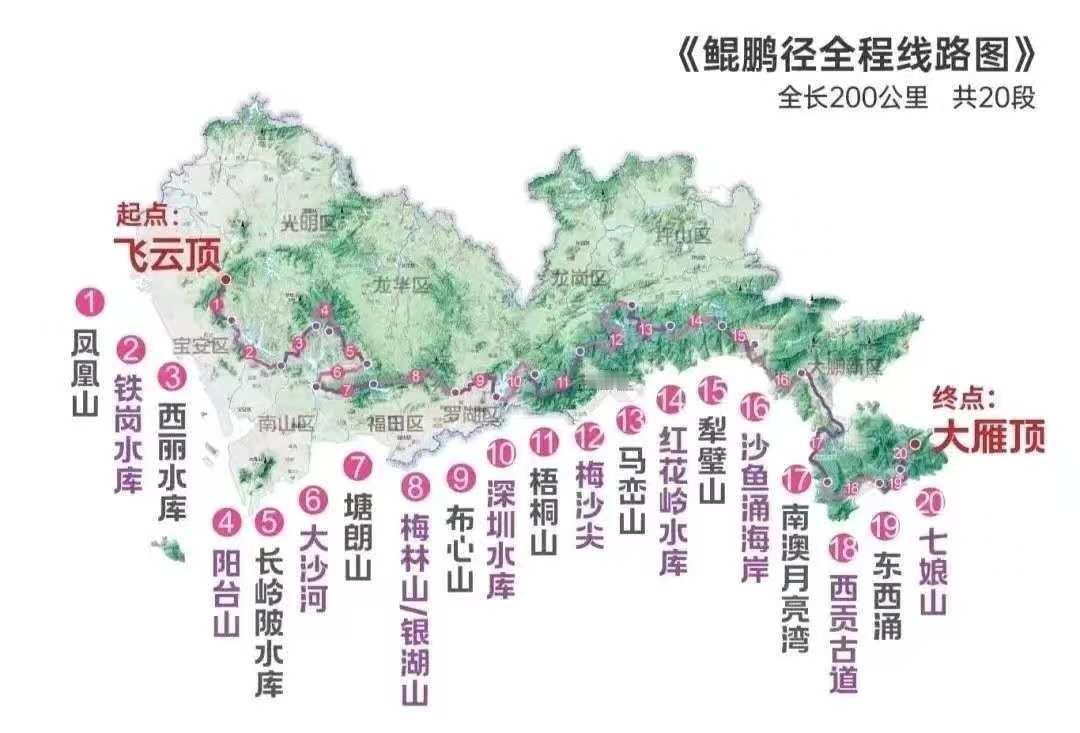 深圳最长徒步路径鲲鹏径,这个五一长假准备去挑战,同时今天给大家隆重推荐这一条深圳徒步路线,一路山海连城,风景蔚为壮观。 深圳鲲鹏径全长200公里,起于深圳光明凤凰山飞云顶,终于深圳大鹏七娘山大雁顶。一路经过深圳著名的山峰和水库,也经过深圳最美的海岸线。包括凤凰山、羊台山、塘朗山、梅林山、梧桐山、马峦山、七娘山,包括铁岗水库、西丽水库、长岭皮水库、深圳水库,然后沿着深圳东部最美黄金海岸线直达七娘山,无限海景等着你。准备好去挑战!旅行 发现深圳美好