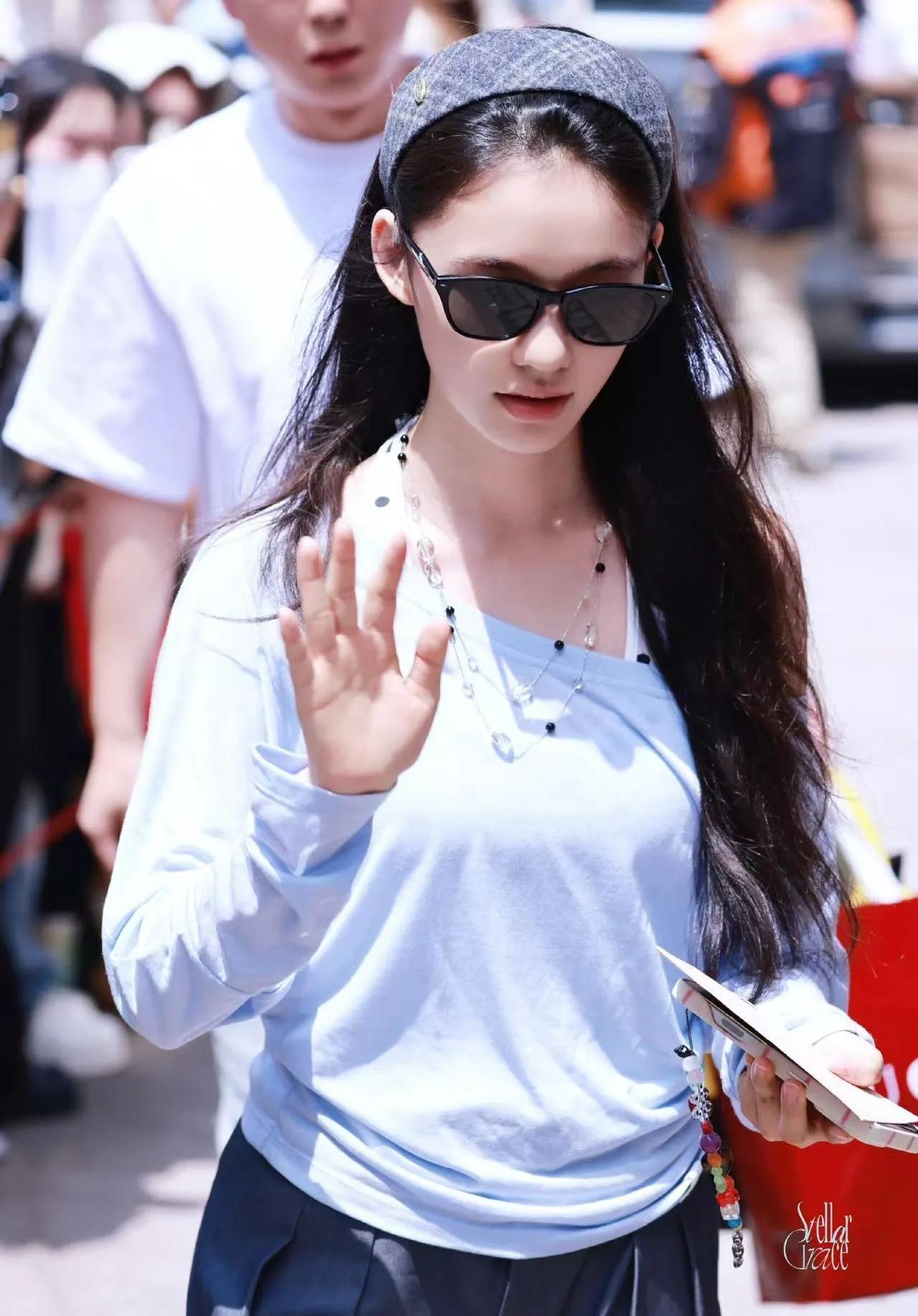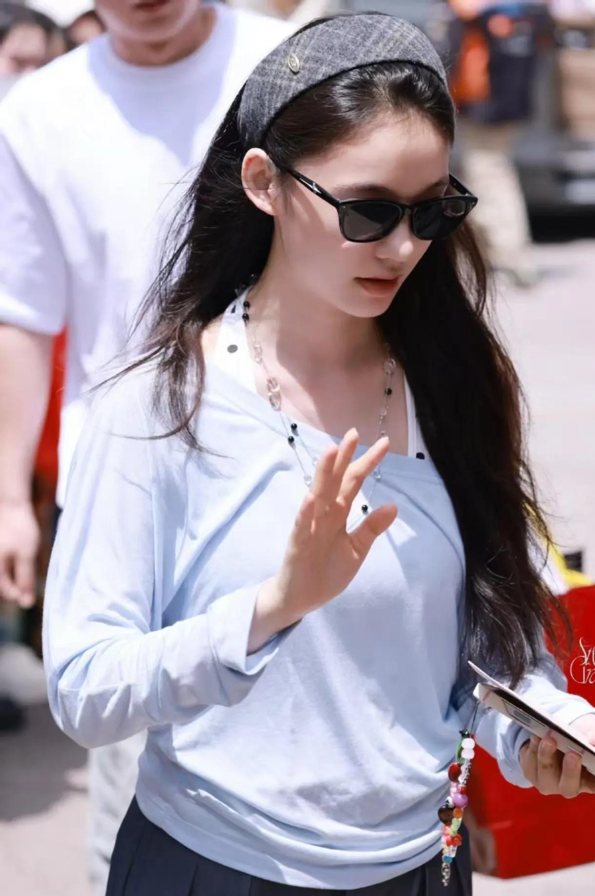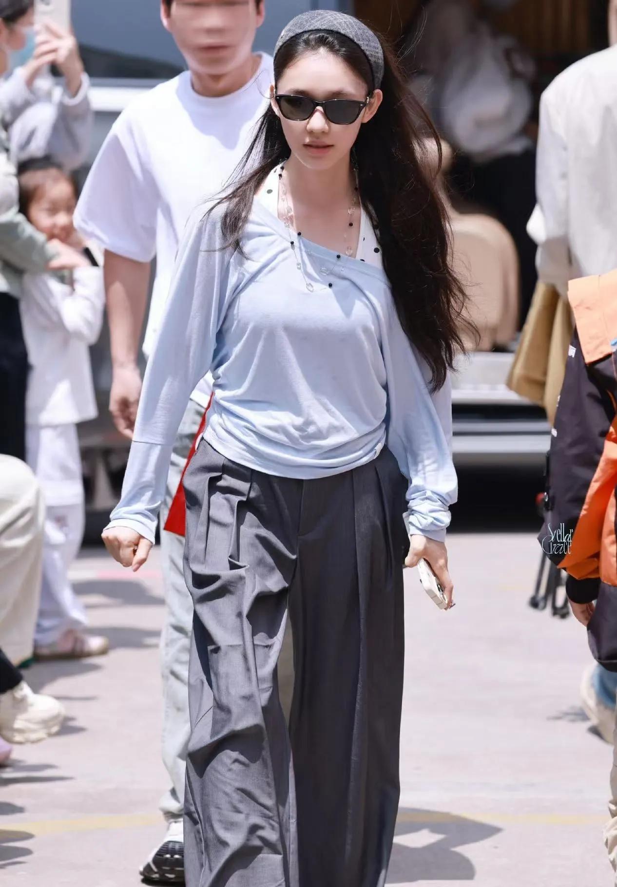 林允这组浅色系穿搭真的戳中审美!baby蓝长袖衫温柔又显白,斜领设计自带慵懒随性氛围✨ 搭配灰色阔腿裤拉长比例,藏肉又显瘦。再配上格纹发箍与墨镜,层次感拉满,休闲减龄还透着高级感,妥妥的夏日穿搭模板~ 林允 林允私服 清冷系穿搭