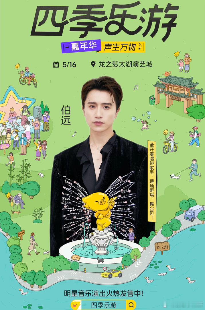 尤长靖伯远李鑫一嘉羿空降湖州 5月16日,龙之梦太湖演艺城。这四个人的声音,会在湖州的夜空里飘很久。想被治愈的,想被点燃的,想被感动的,都能在这场找到。四季乐游·嘉年华四季乐游