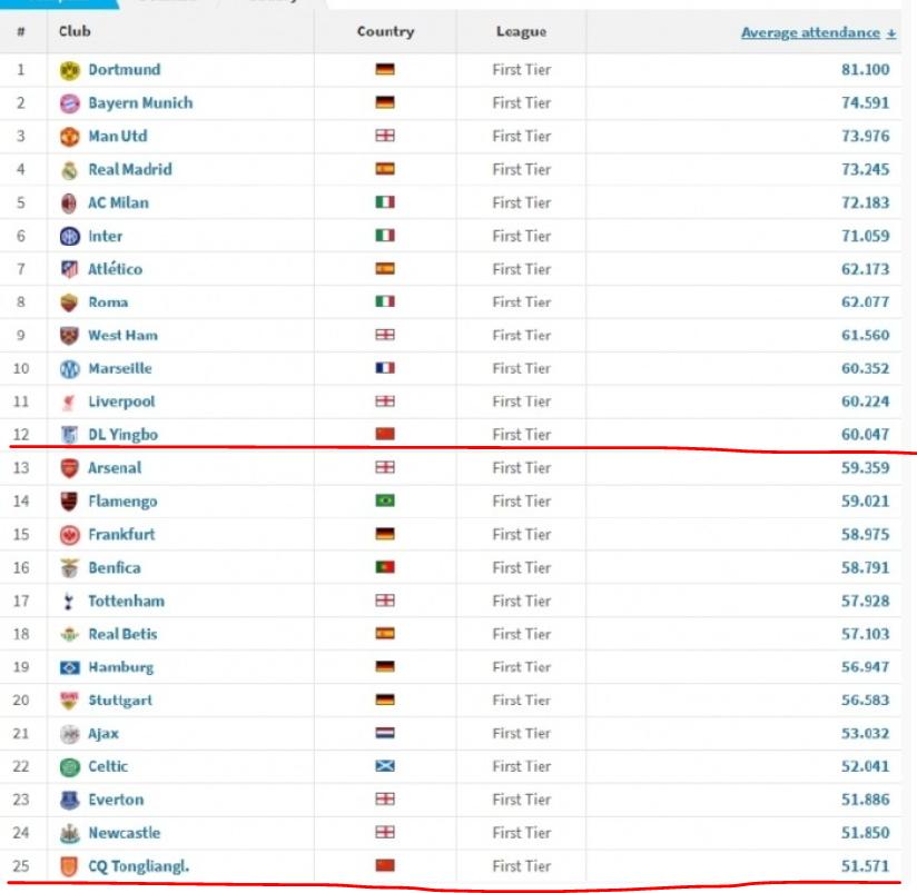 中国足球或许还没有那么强,但中国球迷绝对是世界上顶级的。在最新的球场上座率统计排行榜上,赫然出现了2个中国球队的名字,分别是大连英博和重庆铜梁龙,大连英博依靠每场比赛平均到场球迷超过60000人,排名榜单第11位,甚至高于英超豪门阿森纳的上座率,阿森纳场均观众数只有59000人左右。重庆铜梁龙场均51571人,位列全球第25位,也确实非常厉害了。 球迷这么给力,希望中国球队实力未来也能进入世界榜单前30!