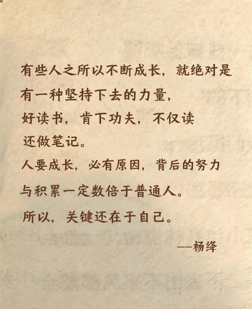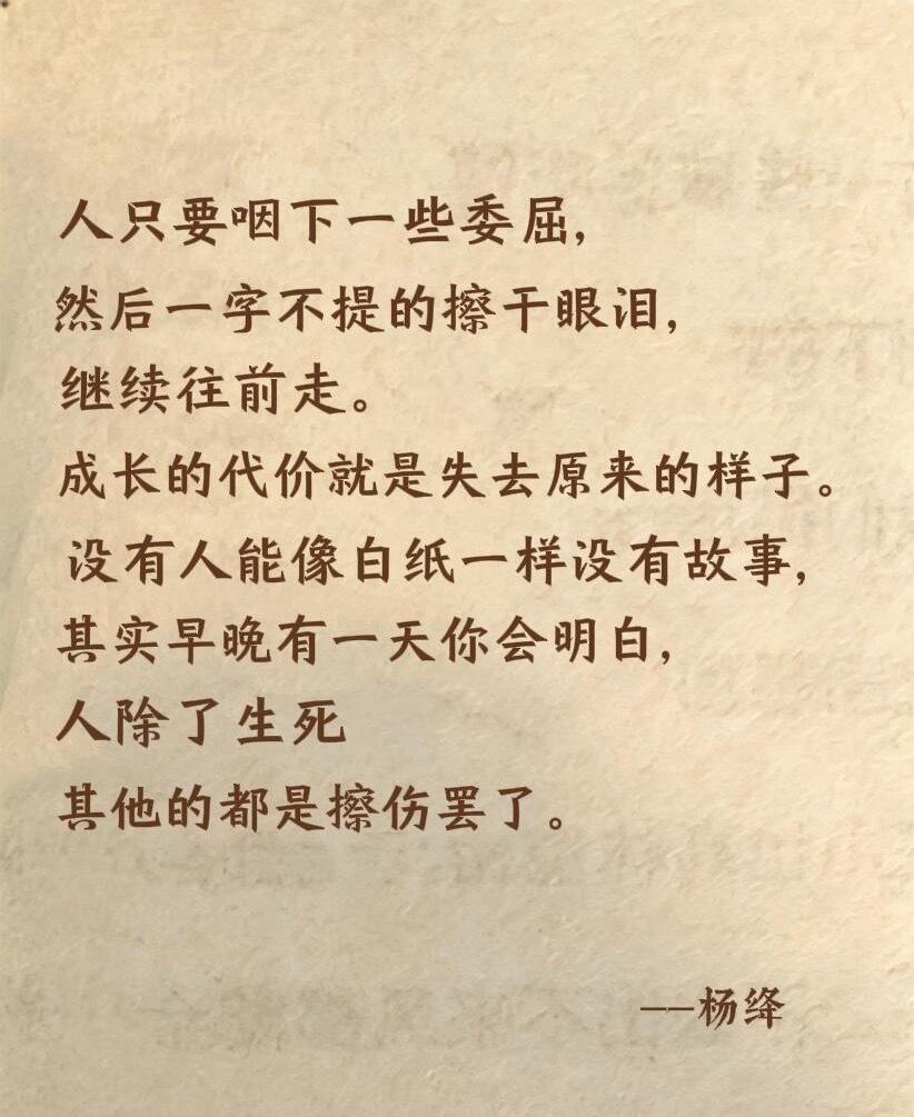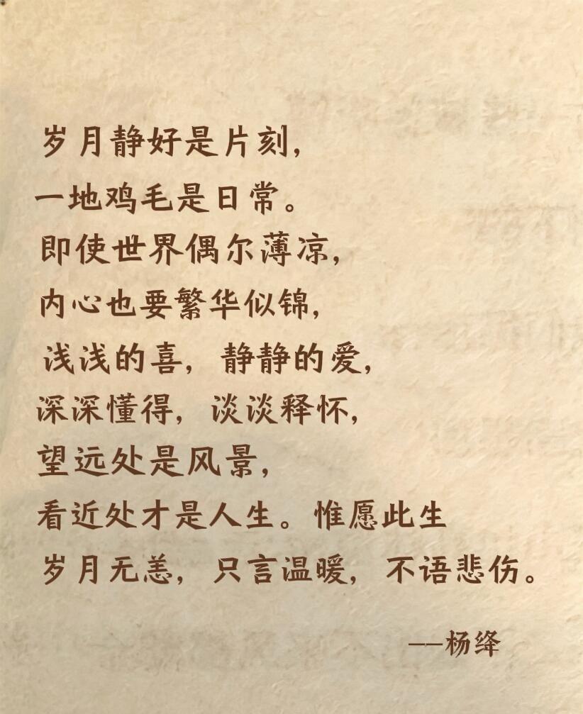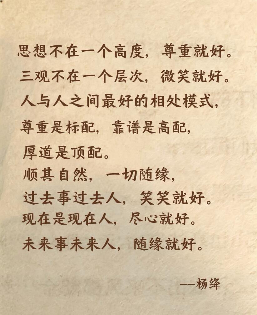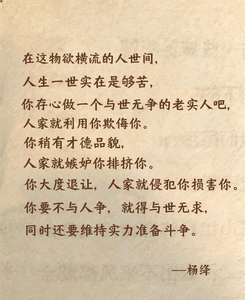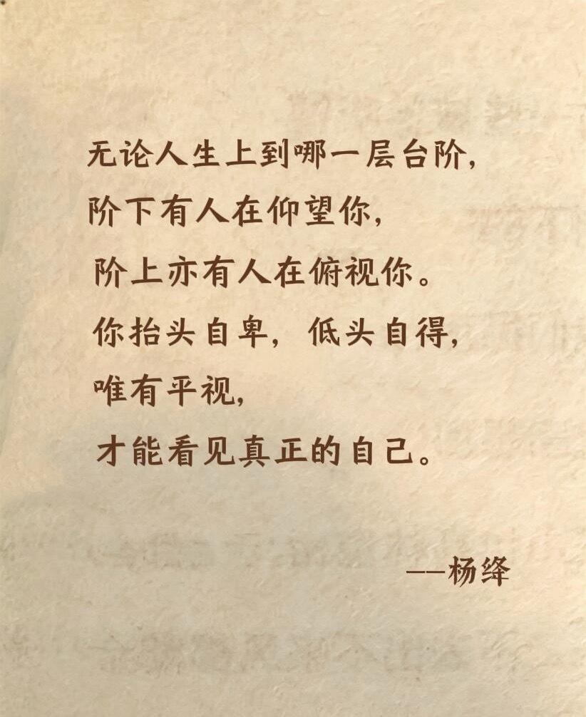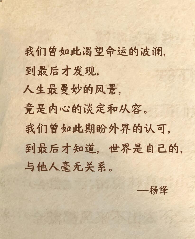 读懂杨绛,瞬间戒掉 90% 的精神内耗🌿 人这一生, 向外看是攀比,向内修才是答案。 不必仰望别人,也别轻视自己 平视世界,才会看见真正的自己。 不必渴求所有人的认可, 不必纠结无意义的纷争。 慢慢沉淀,悄悄深耕, 咽下委屈,稳住底气。 终会明白: 人生最美的风景, 从来不是外界的喧嚣与波澜, 而是内心的淡定与从容。 世界是自己的, 与他人,毫无干系。 往后余生,修好自身,温暖自持, 与生活温柔和解✨