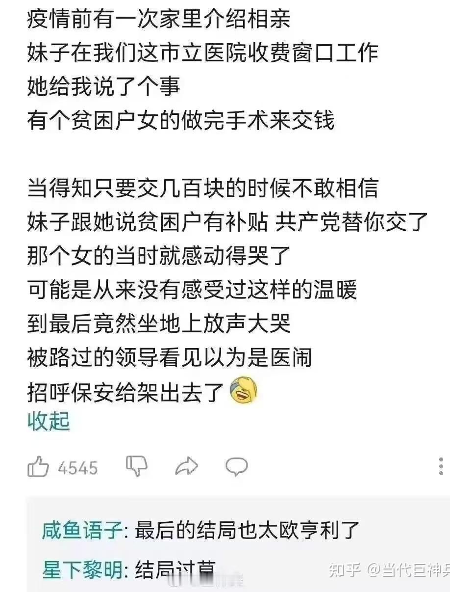 《欧.亨利:医闹》相亲的妹子在市立医院收费窗口工作,她说了个事:有个贫困户女的做完手术来交钱,不敢相信只要交几百块。妹子跟她说贫困户有补贴,共产党替你交了。那个女的感动得哭了,可能是从来没有感受过这样的温暖吧,到最后竟然坐地上放声大哭。路过的医院领导看见,以为是医闹,招呼保安给架出去了……