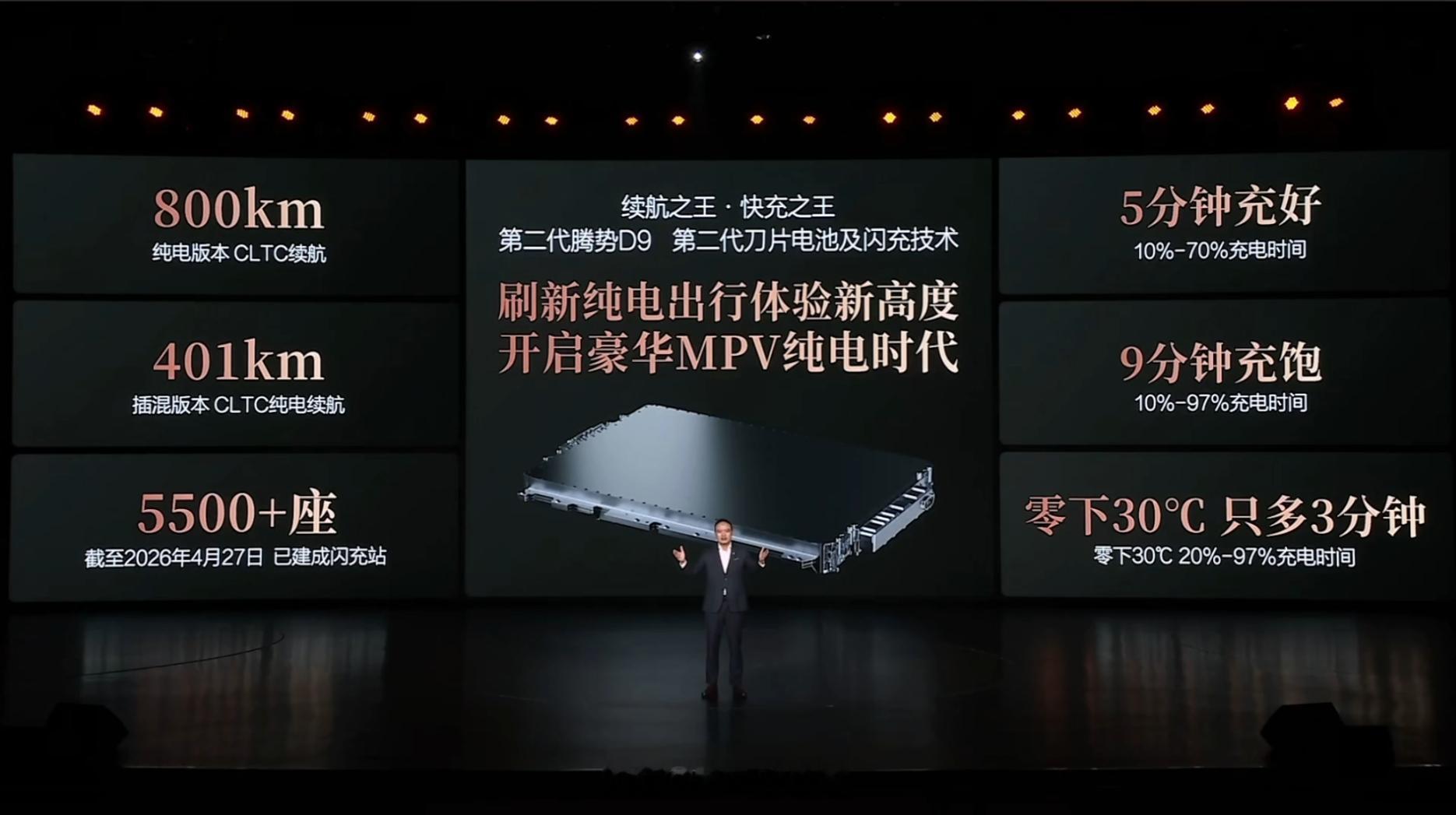 第二代腾势D9纯电版CLTC续航高达800公里,插混版CLTC纯电续航高达401公里。而且还把刚发布的第二代刀片电池和闪充技术直接上车。