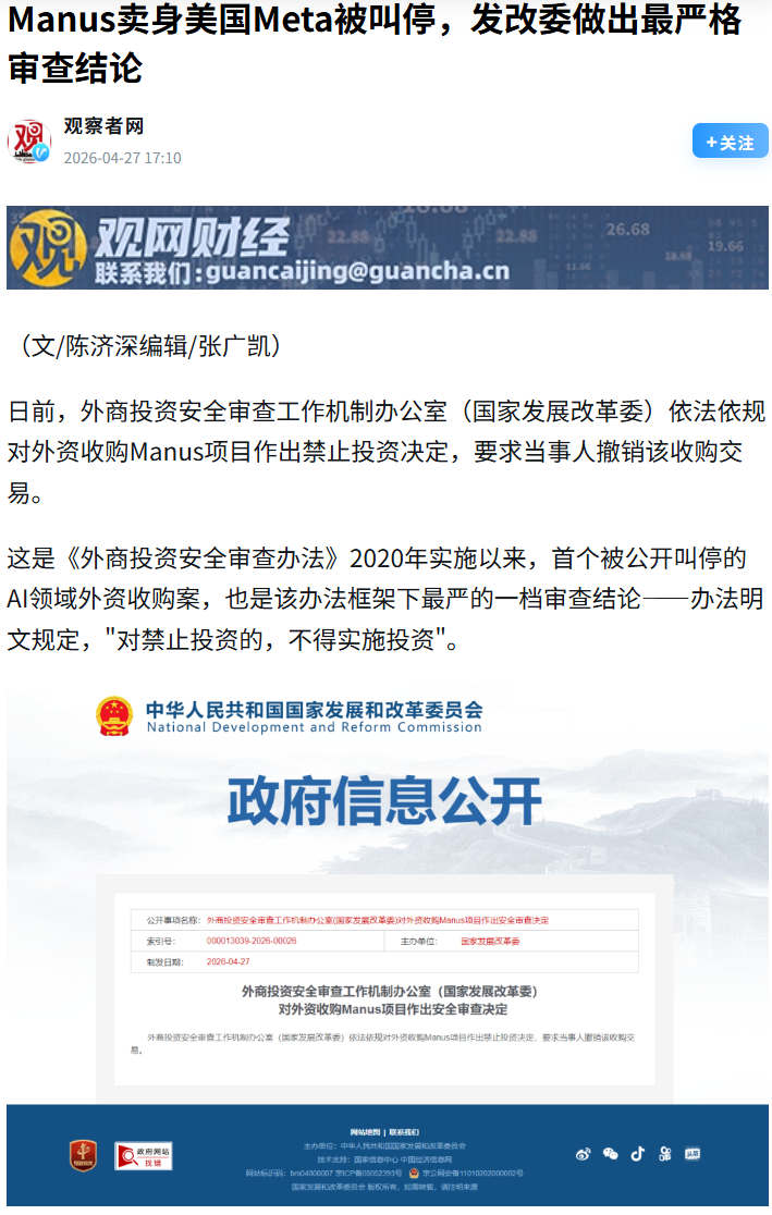 首先要明确,外商投资安全审查是国家主权的正当行使,中国依法依规禁止Meta收购Manus,维护国家安全和技术主权,这符合国际通行做法。 但是,我们也应理性看待。老胡认为,一方面企业调整注册地是市场行为,不必过度解读;另一方面,核心技术和数据如何从中国转移出境,才是监管的真正焦点。这提醒我们,中美博弈下科技企业跨境交易的合规风险正在全面上升。我这不是替谁辩解,纯属个人观点。 我们要看到,AIAgent赛道并没有等Manus,国产力量已经崛起。总体而言大方向是好的,个别企业起伏不影响中国科技竞争力提升的大局。
