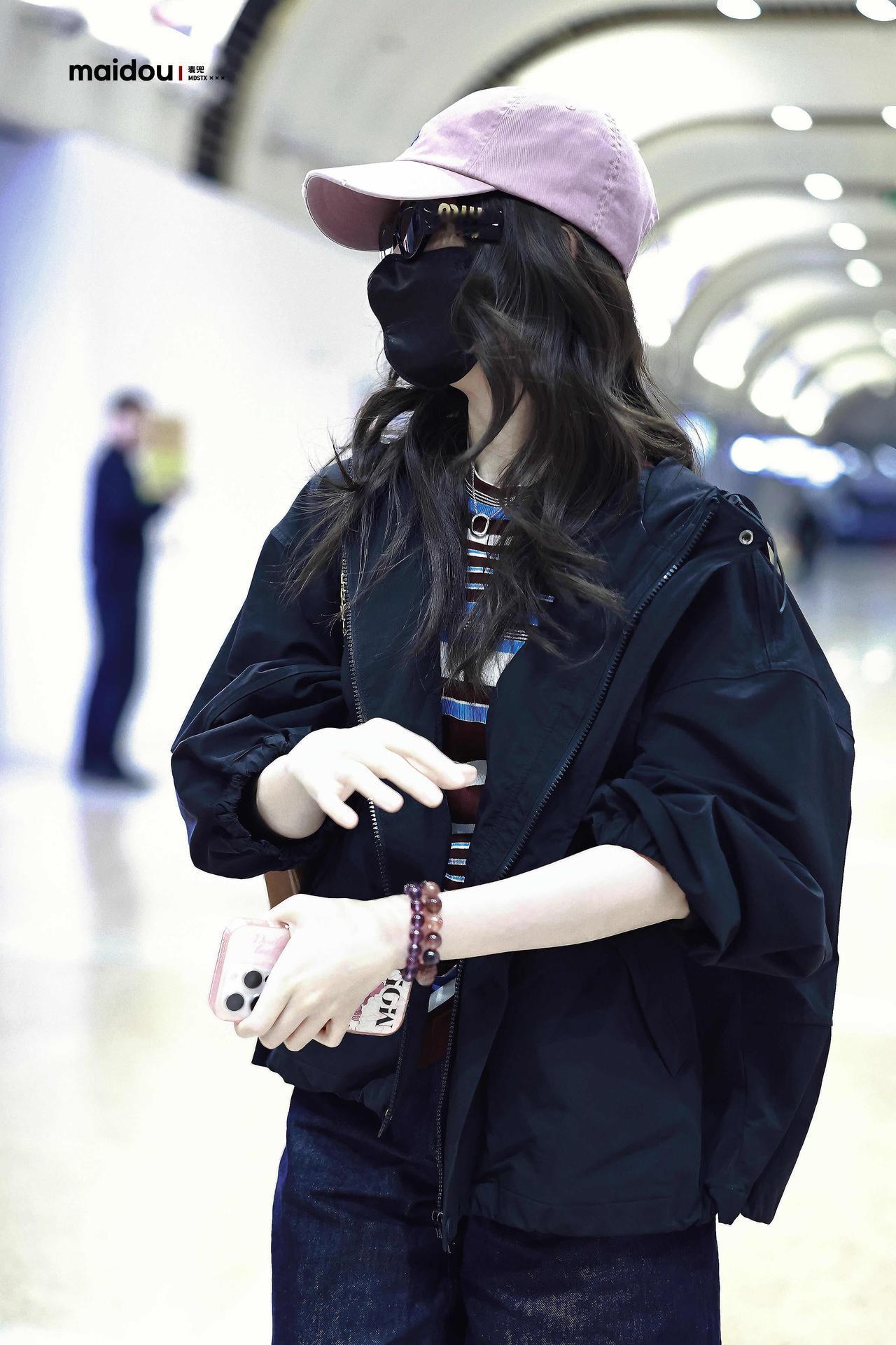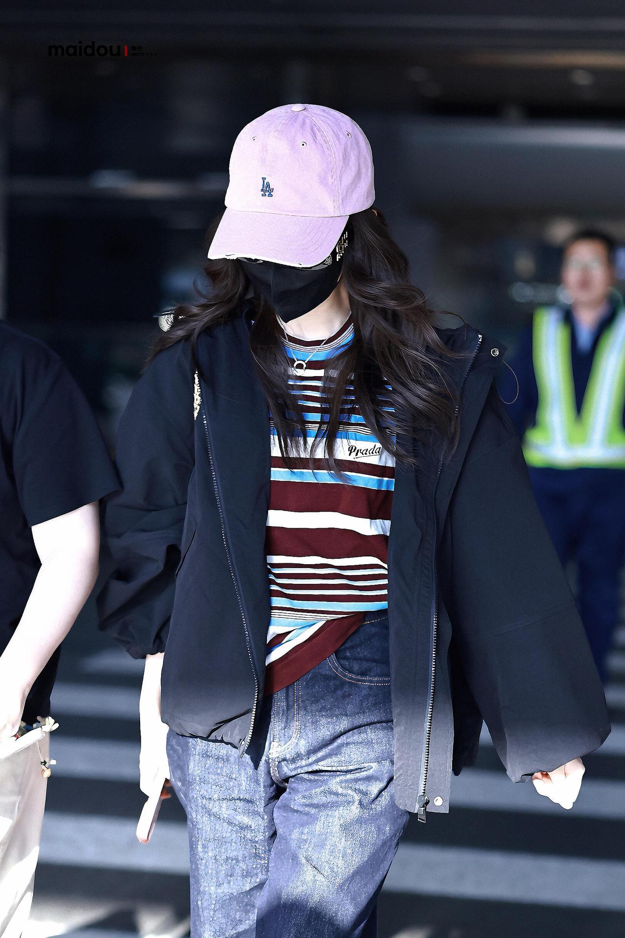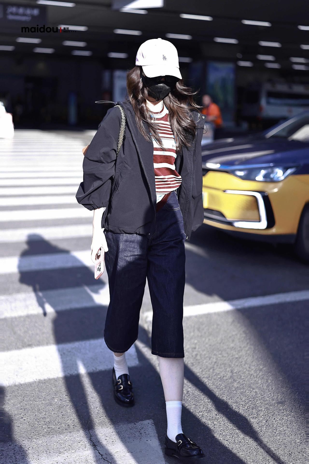 毛晓彤街拍,深色系穿搭好酷! 黑色廓形外套松弛又利落,叠穿条纹T恤添了几分 复古活力,搭配深牛仔中裤与乐福鞋,又甜又飒。粉调棒球帽中和了深色的沉闷,同色系墨镜、棕色包包点缀细节,整套Look舒适随性,是超适合出行的松弛感范本。