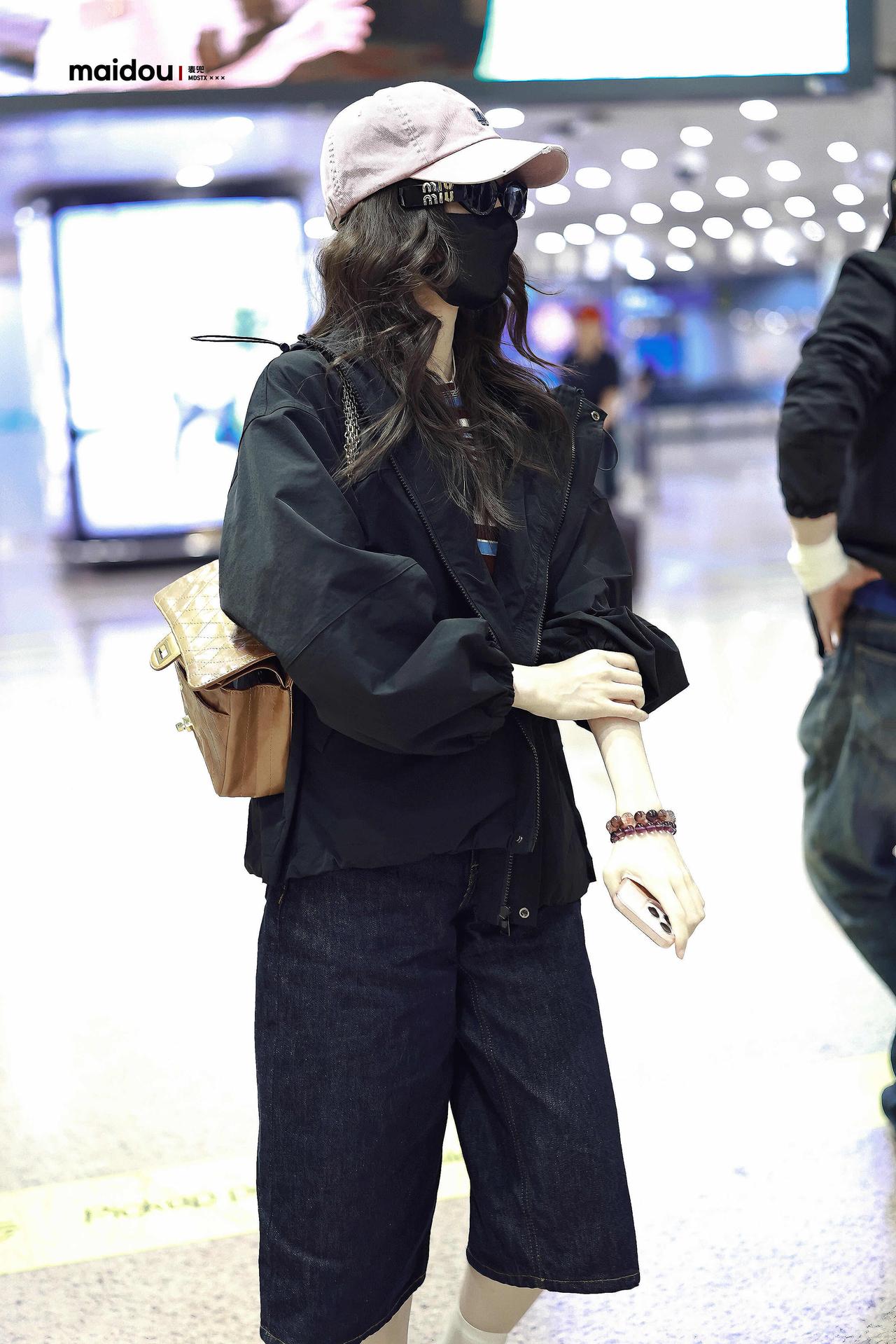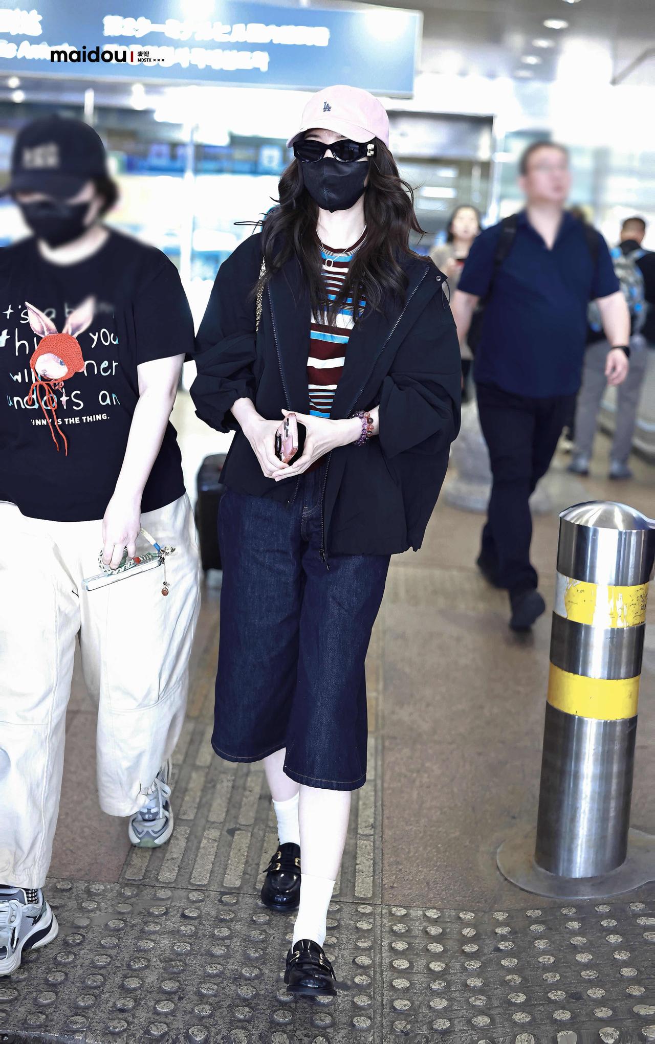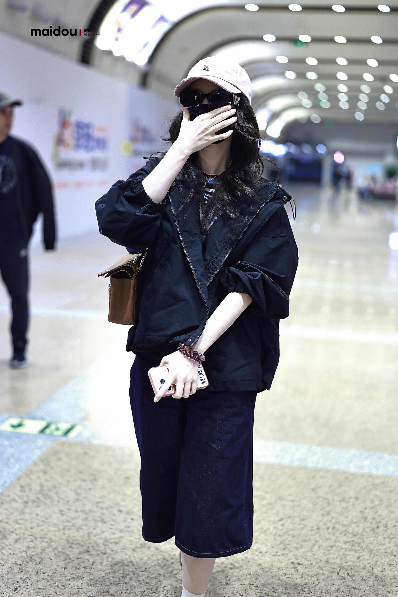 毛晓彤街拍,深色系穿搭好酷! 黑色廓形外套松弛又利落,叠穿条纹T恤添了几分 复古活力,搭配深牛仔中裤与乐福鞋,又甜又飒。粉调棒球帽中和了深色的沉闷,同色系墨镜、棕色包包点缀细节,整套Look舒适随性,是超适合出行的松弛感范本。