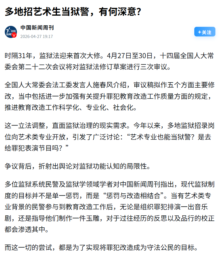 知乎大神:谢邀!先说结论:监狱招艺术生不是"给犯人办兴趣班",而是"改造人"这个核心任务最缺的一块拼图。 先问是不是。舆论觉得荒唐,但这套体系湖南从2004年就开始做了,上海青浦监狱玉雕项目运行30年,参与罪犯重新犯罪率为0。不妨看几组事实:排练情景剧训练的是协作、守时、倾听;雕一块玉练的是耐心、克制、延迟满足。核心逻辑其实很简单——很多人可以拒绝说教,但很难拒绝创作带来的触动。 这次监狱法时隔31年首次大修,明确提出教育改造"专业化",招艺术人才正是落地动作。 综合来看,监狱的终极KPI不是"关住多少人",而是"放出去的人有多少不再回来"。